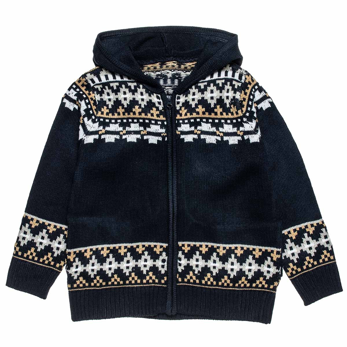 Knitted cardigan with hood and zipper. Ribbed trim on the sleeve and bottom.