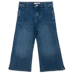 Girls' wide-leg cotton denim jeans with a loose fit through the thighs. Adjustable elastic waistband, zip and button closure, and front and back pockets. }