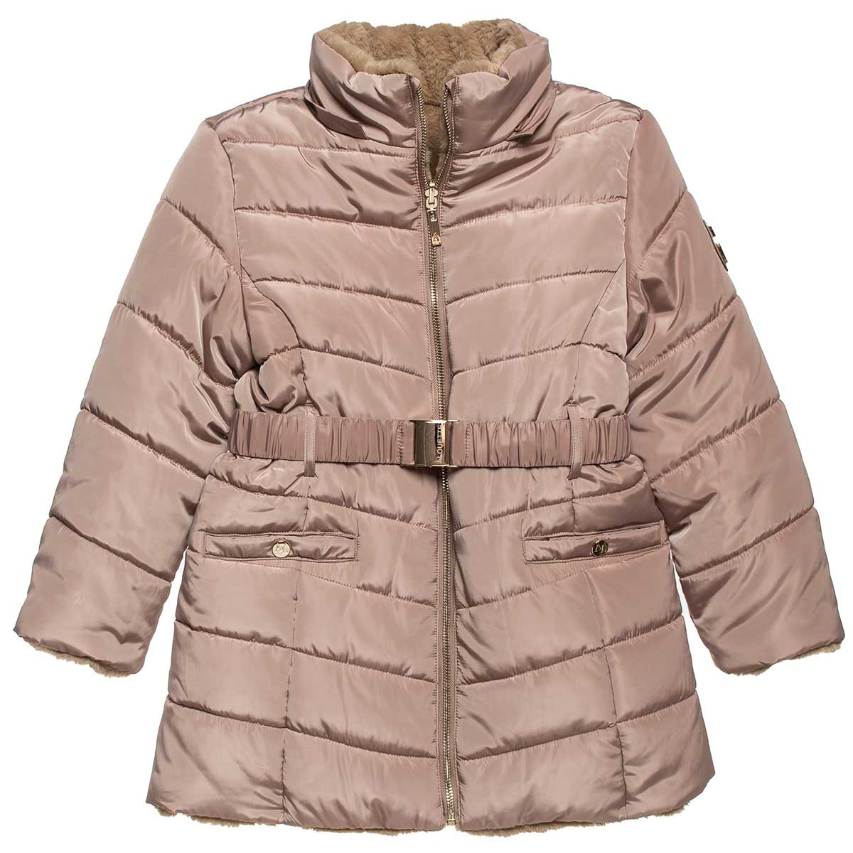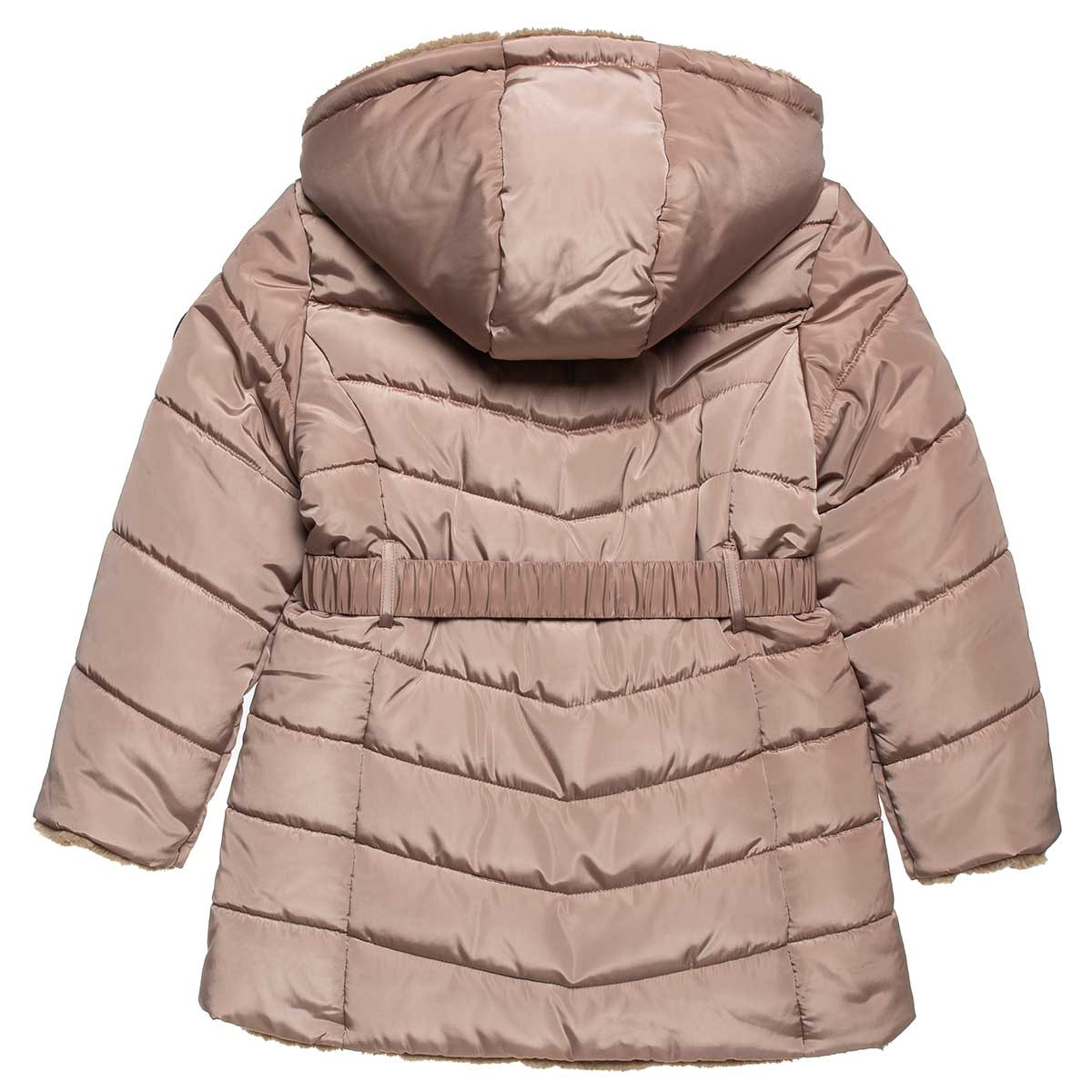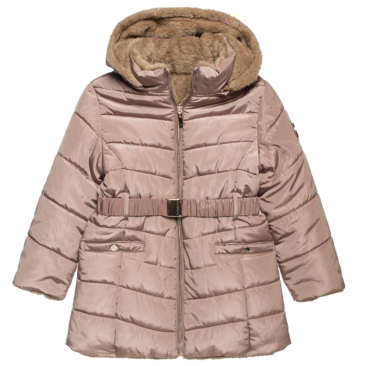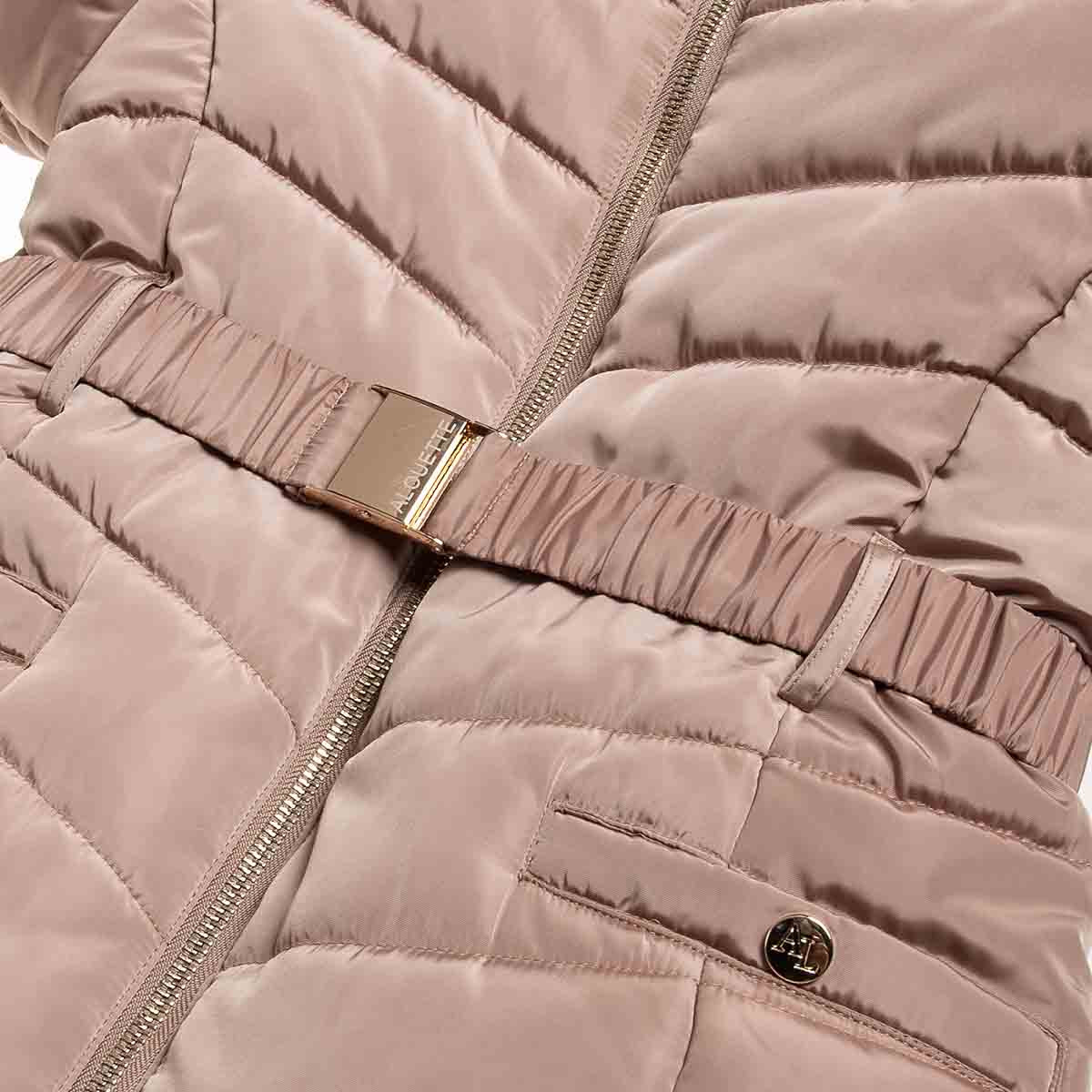 Features a removable hood, gold-tone details, a belt at the waist and front pockets with a button.