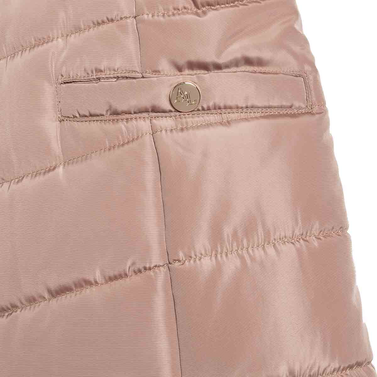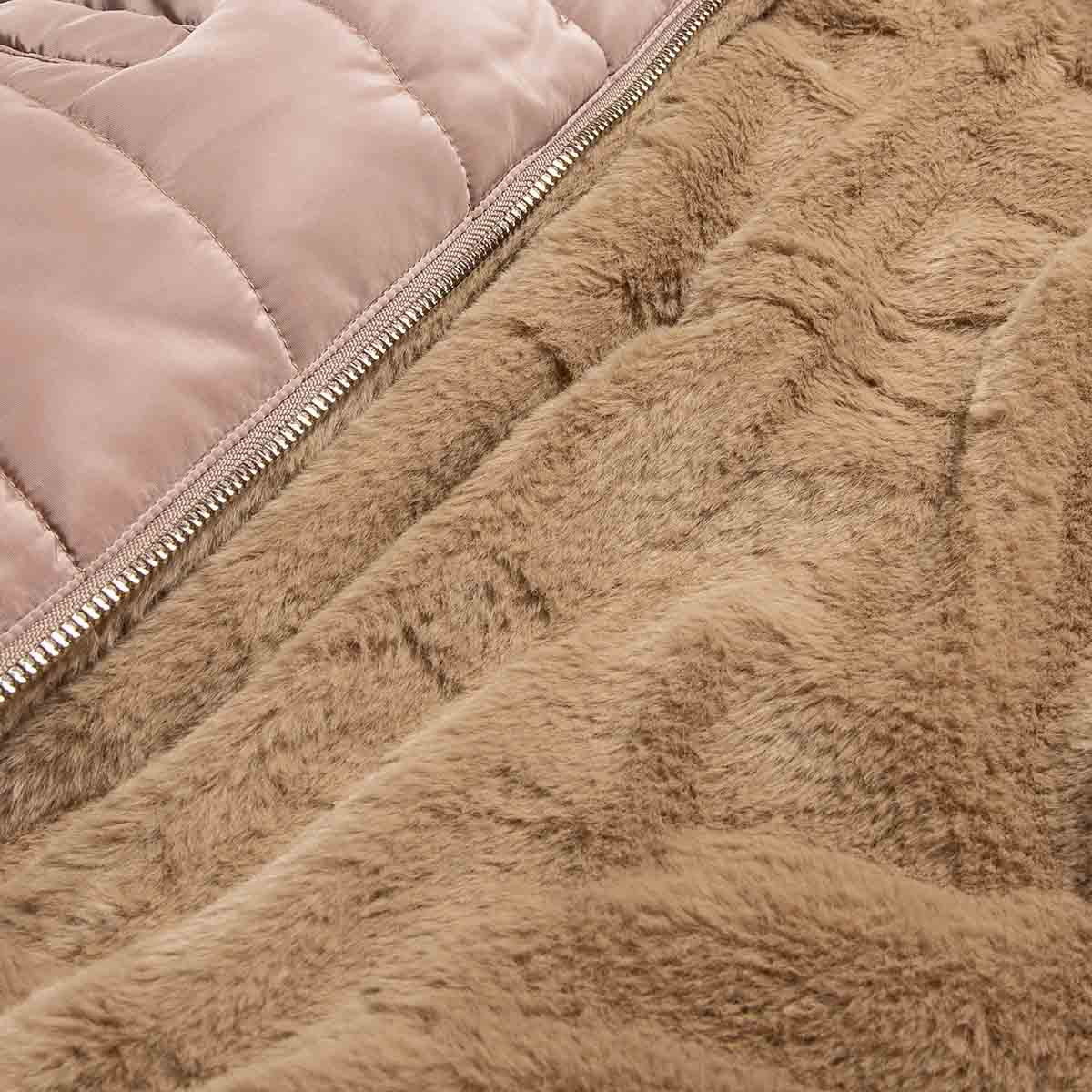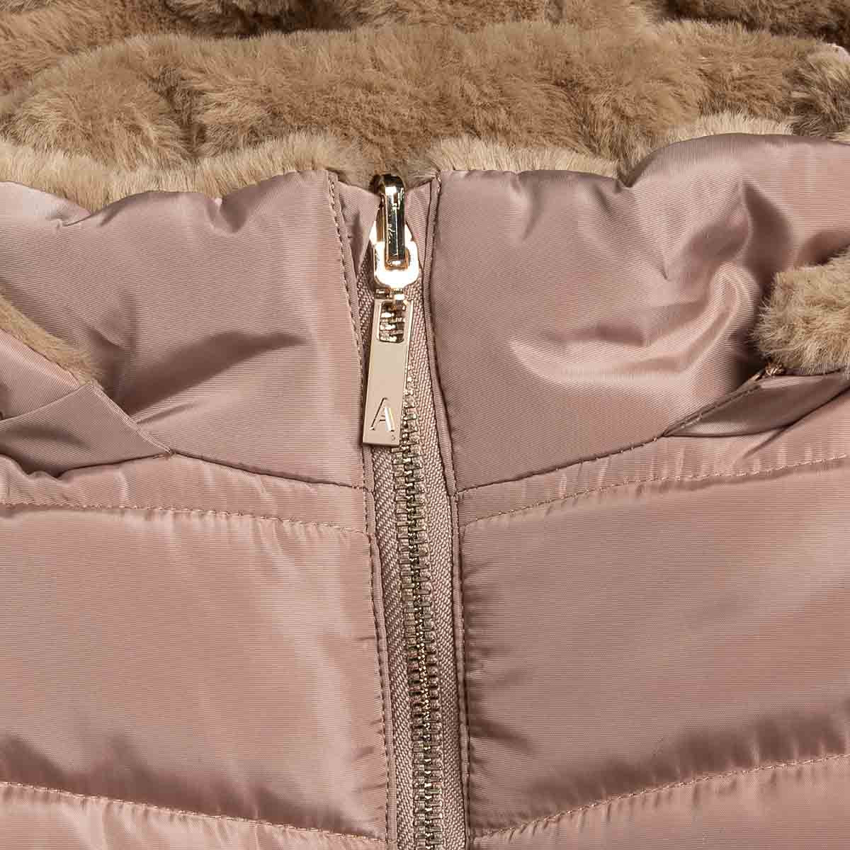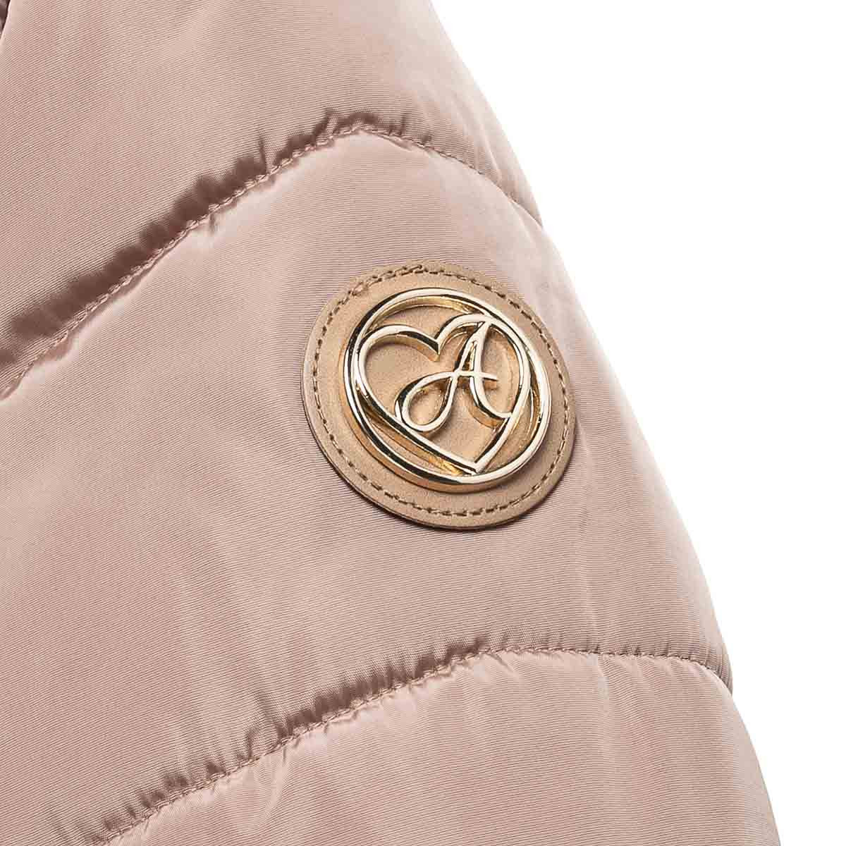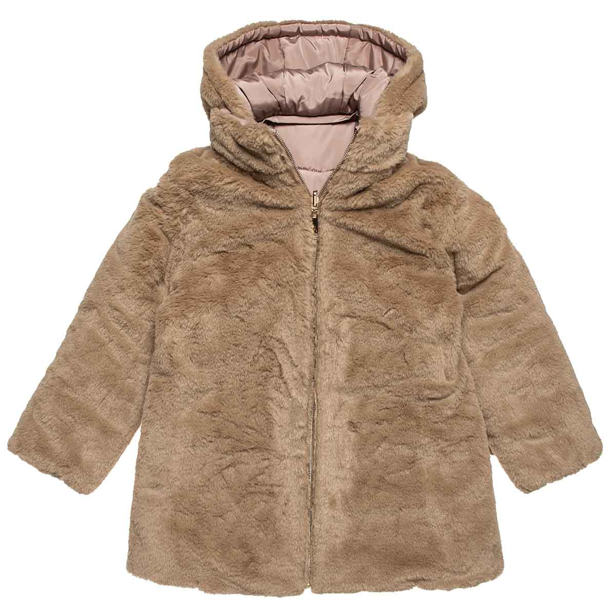Features a removable hood, gold-tone details, a belt at the waist and front pockets with a button.