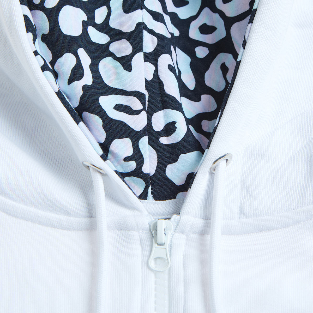 Pattern on the sleeve, front pockets, while the hood is printed on the inside, offering a strong contrast.