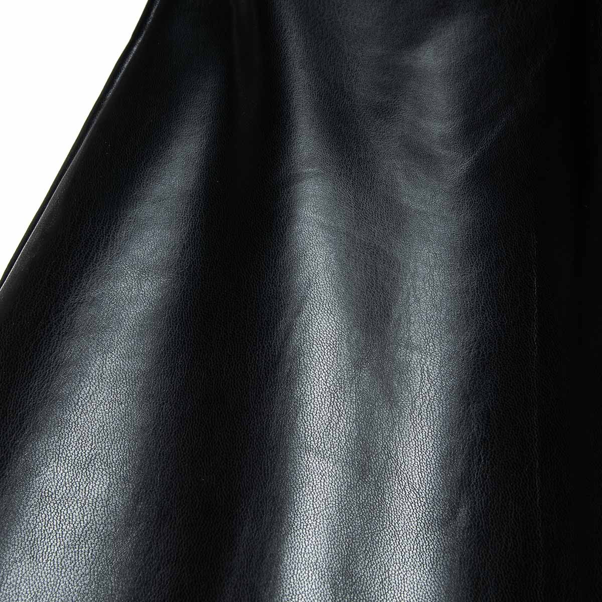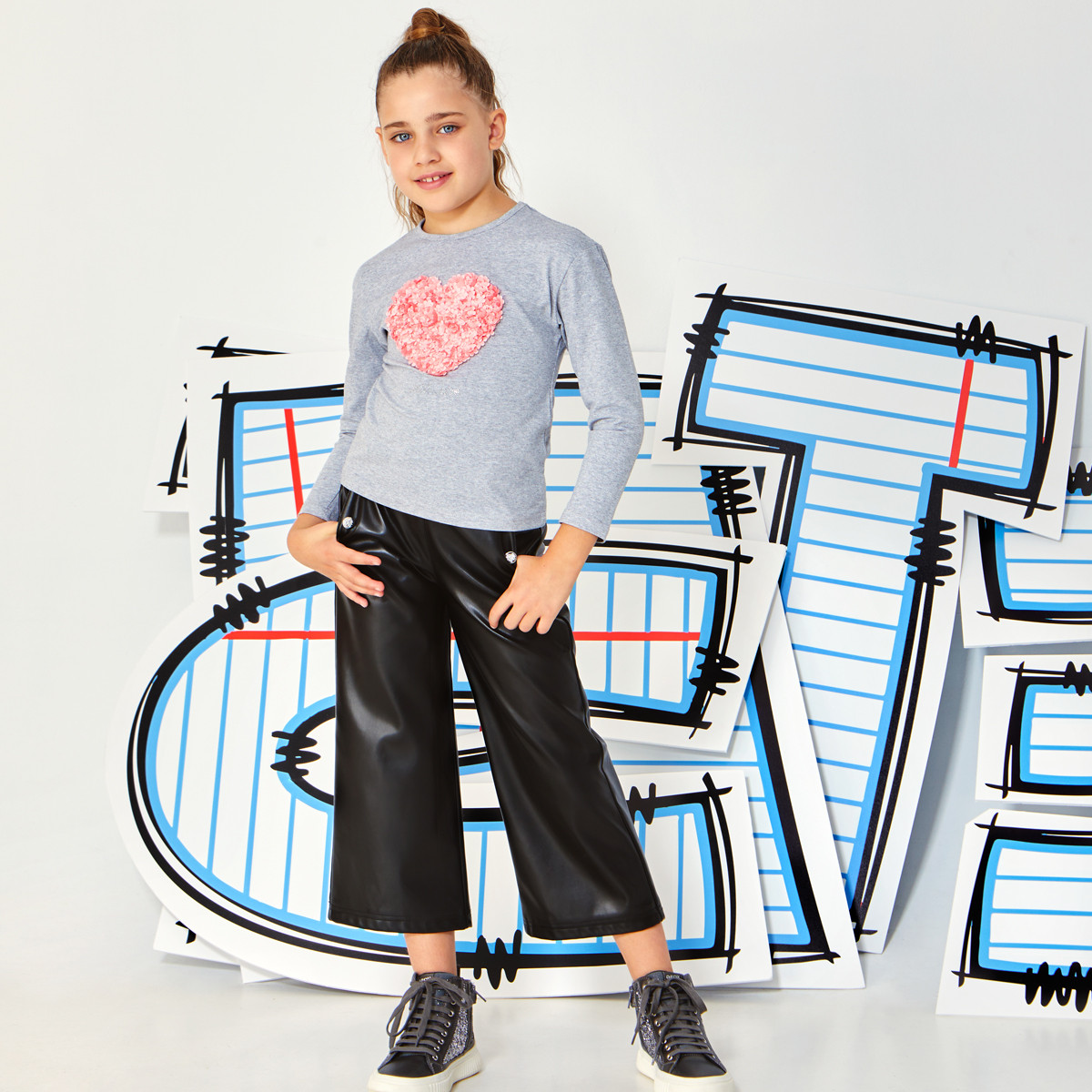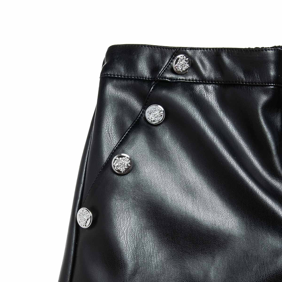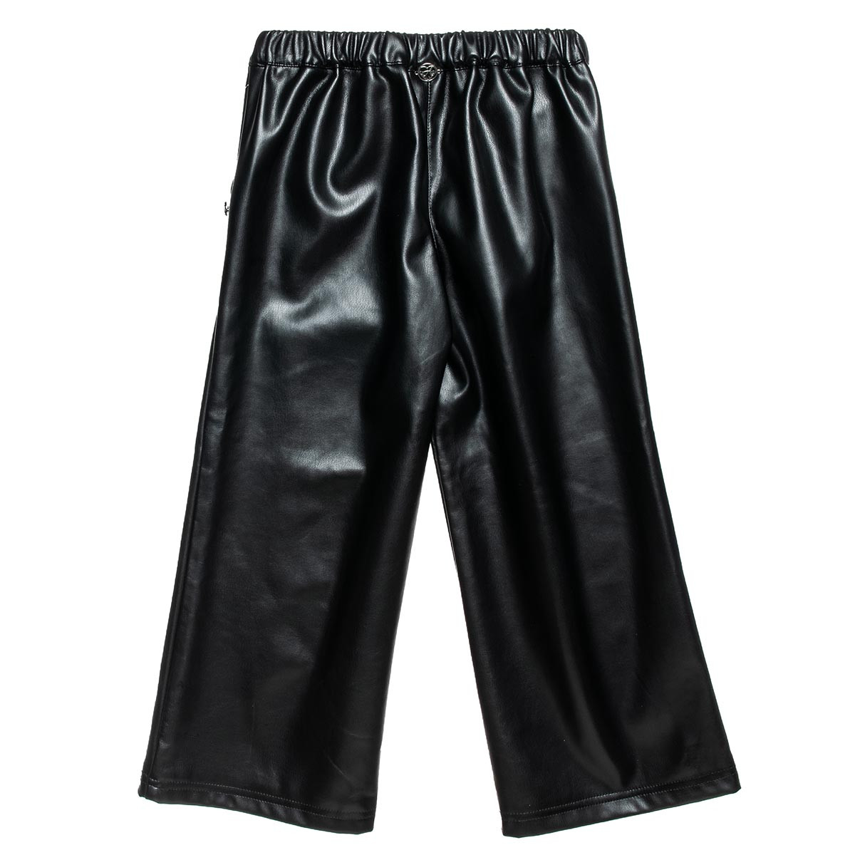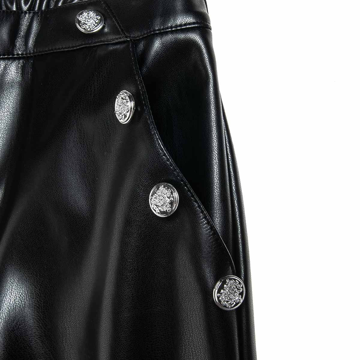 Eco-leather pants with elastic waist. Front pockets with impressive shiny decorative buttons.