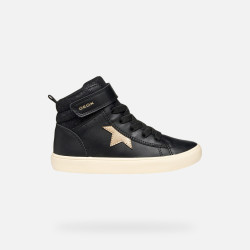 Geox girls' athletic boot, with velcro and laces, with a casual-sportive aesthetic and a modern design that offers a combination of comfort and style for your daily routine. This version features an upper made of leather-effect material and shiny fabric in black and champagne for a modern feel. Ideal for school, sports activities, walks, everywhere!... }