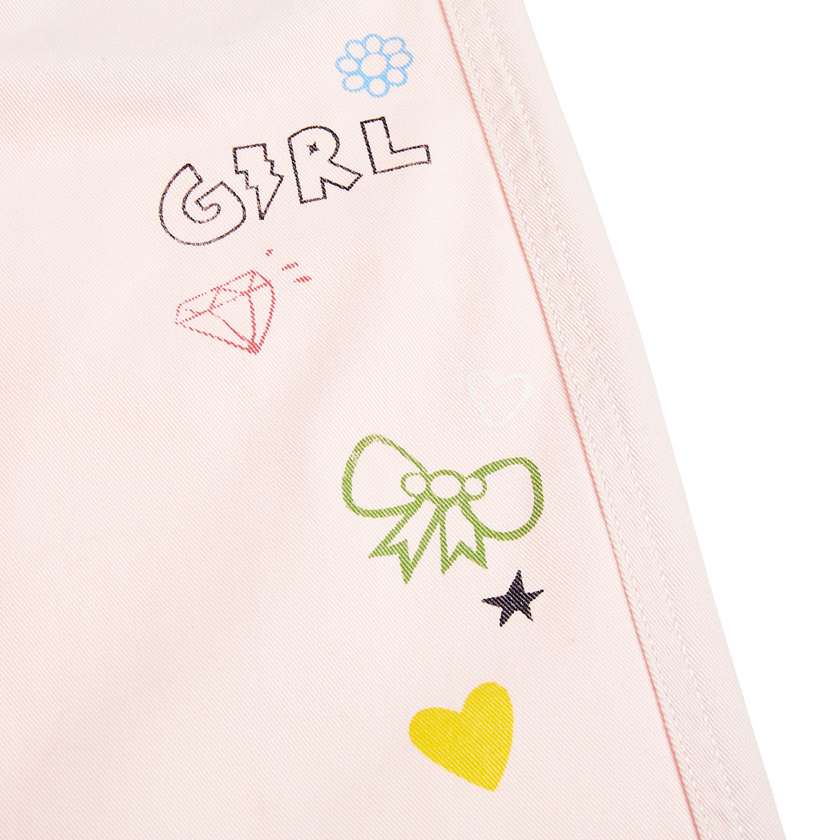 100% cotton denim pants with prints.