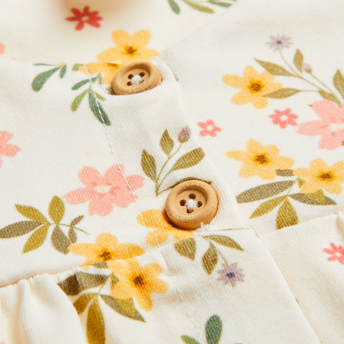 Dress with ruffle sleeves and wood-look buttons.
