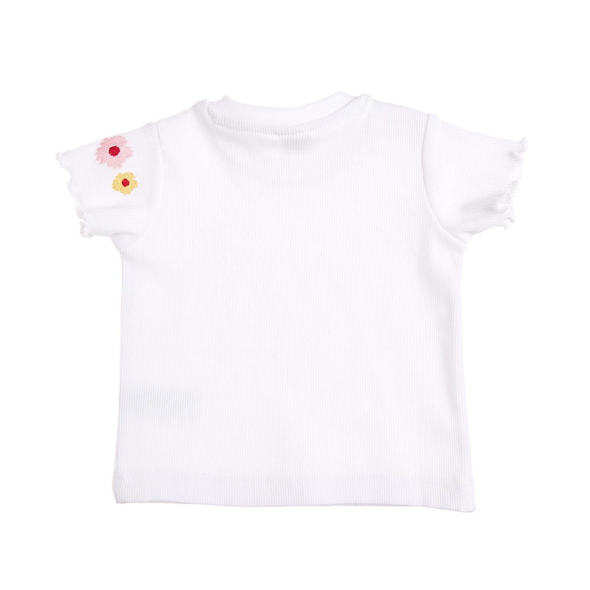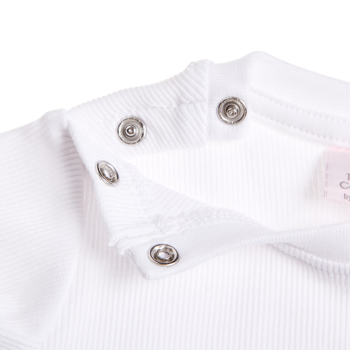 Ribbed blouse with wavy sleeve finish, buttons on the shoulder for easier changing and embroidery on the sleeve.