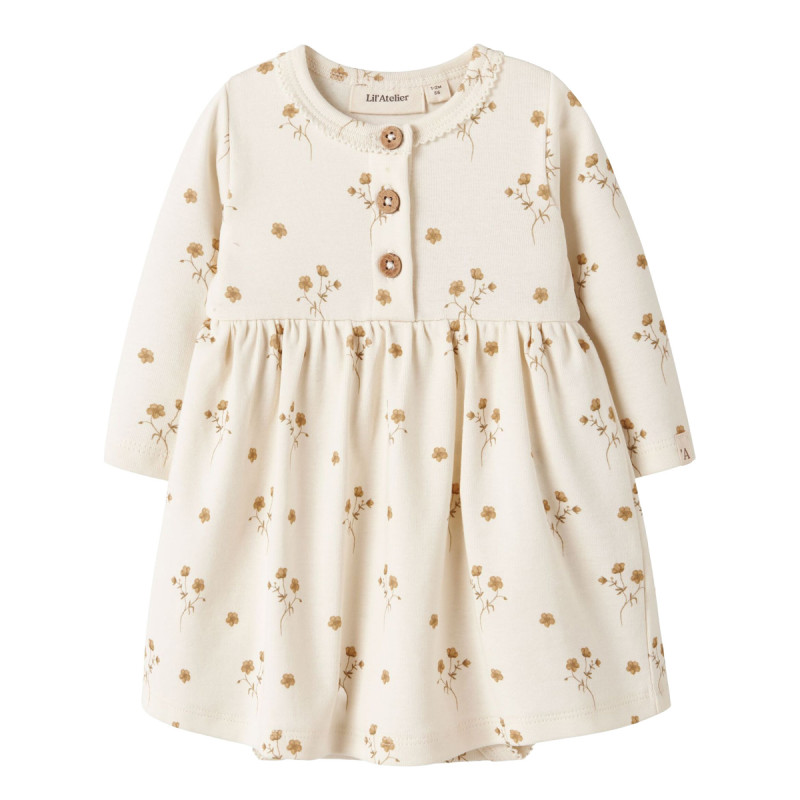 Lil'Atelier organic cotton dress with built-in bodysuit and floral pattern.
