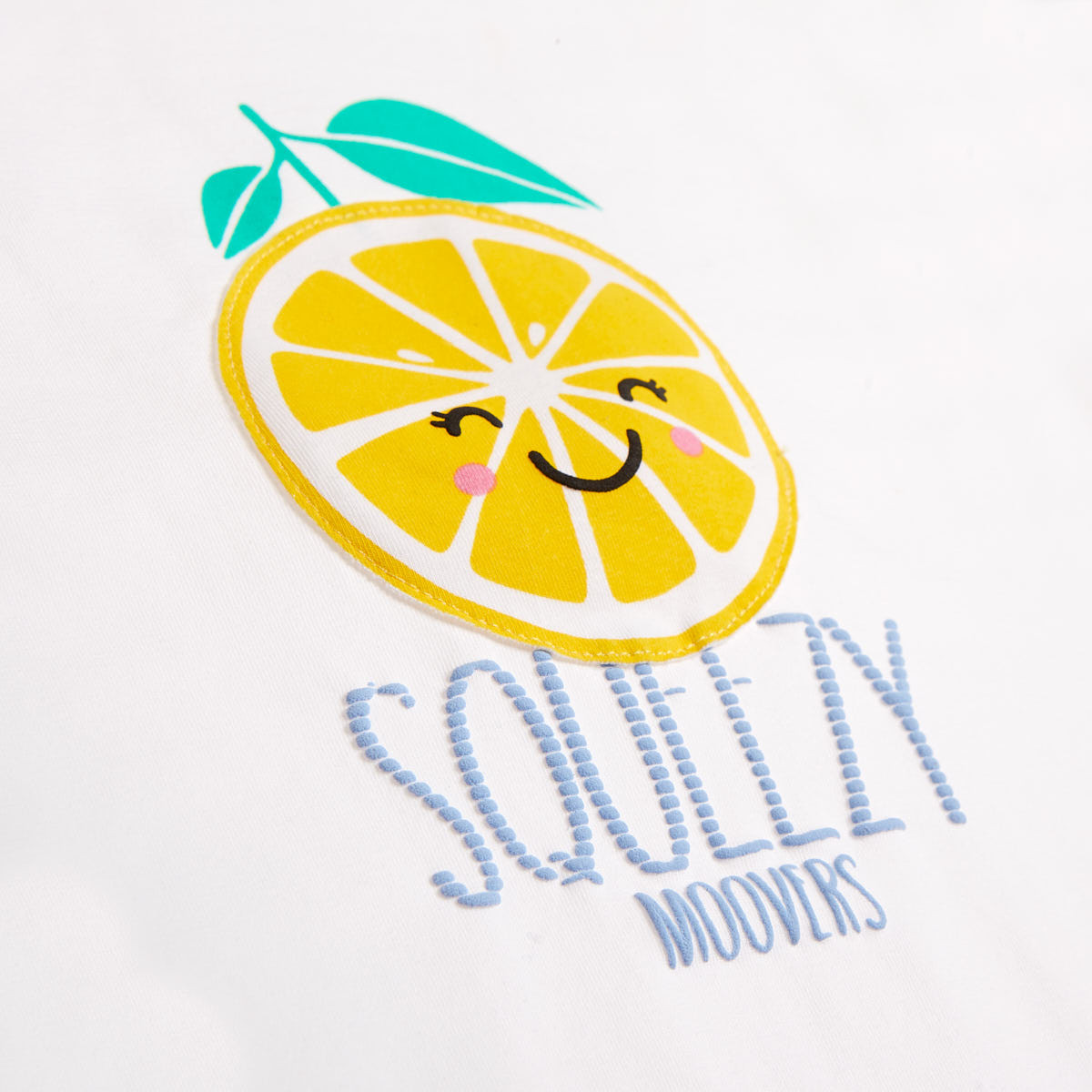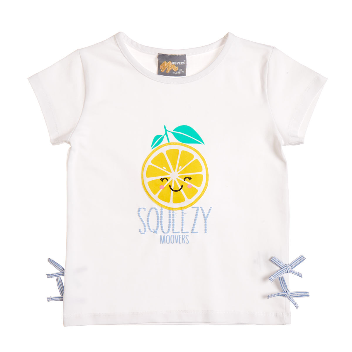 Blouse with decorative bows at the bottom and a front print with embossed letters. The lemon design has an integrated sound-producing toy - pressing the lemon activates the sound -.