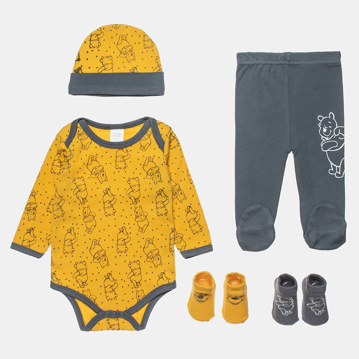100% cotton Disney Winnie the Pooh 5-piece set, consisting of a bodysuit, leggings, socks and a cap, for the first 3 months of the baby!
