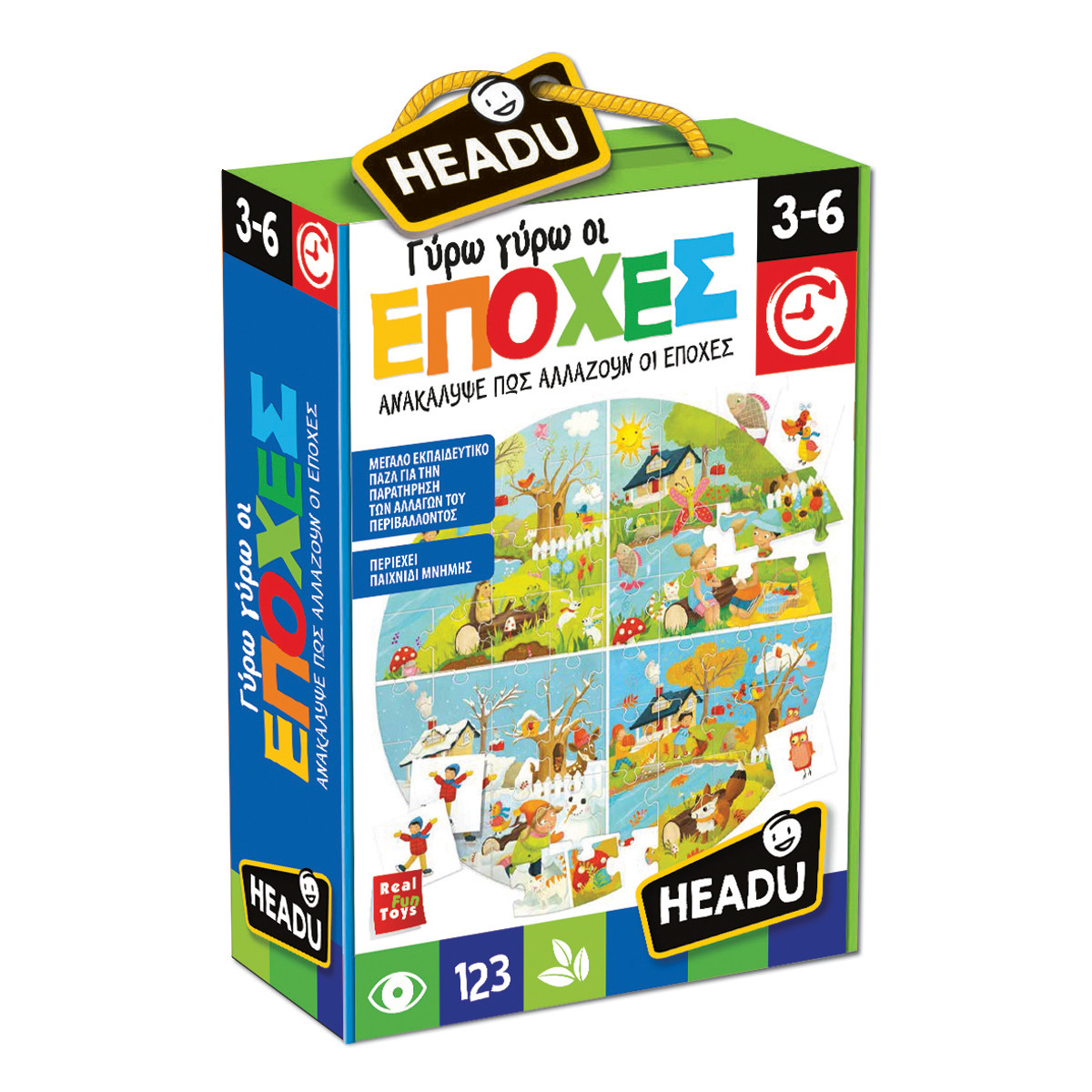 A circular puzzle that allows children to follow the cycle of the seasons. In addition, 56 chips for the memory game.