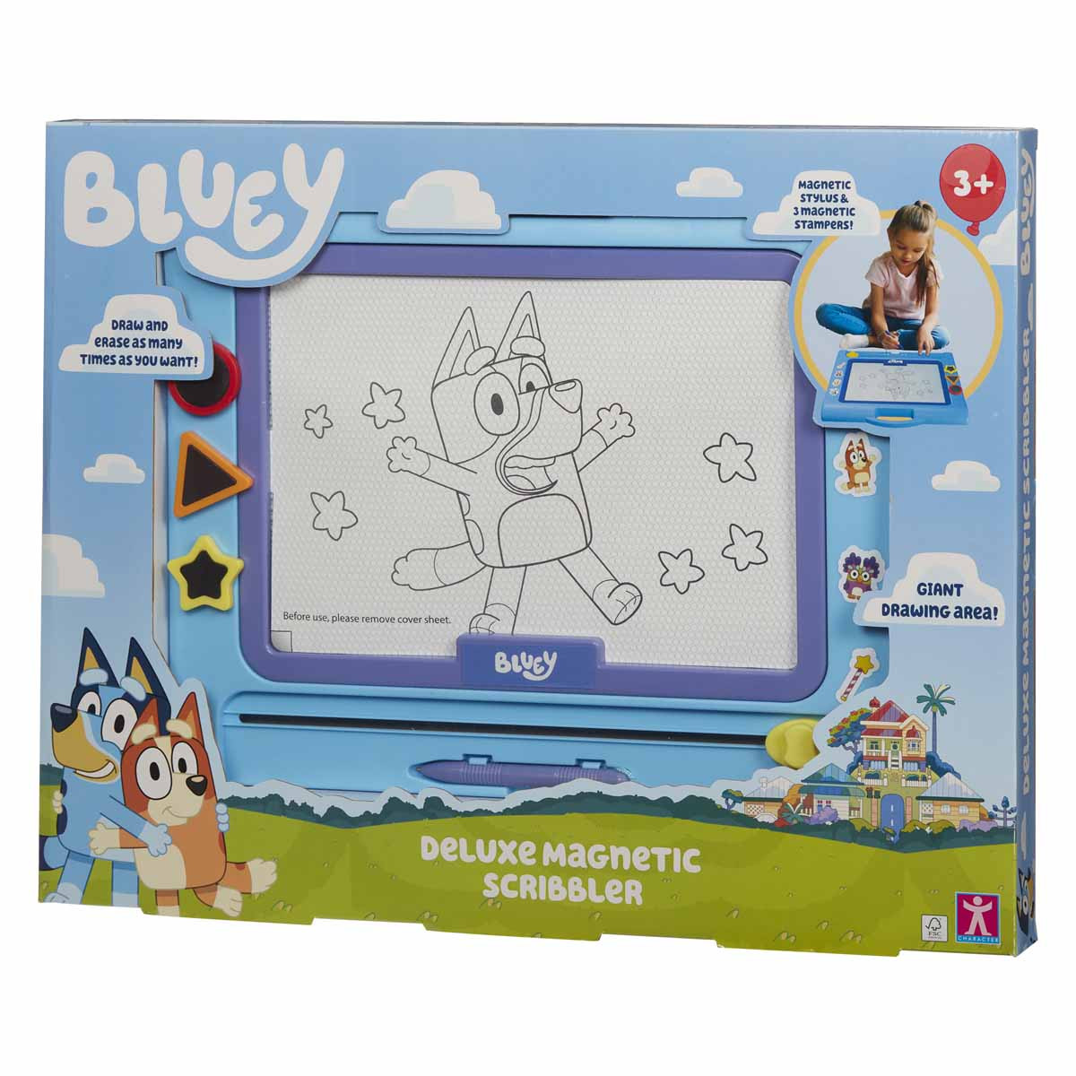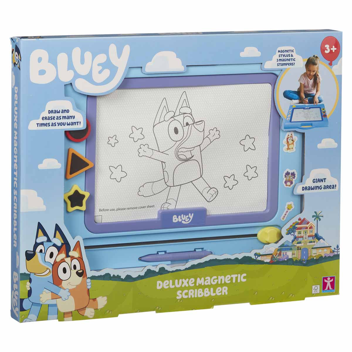 Create your own Bluey doodles on this fun magnetic scribbler, featuring a large drawing area, with custom shaped magnetic stampers. Use the stylus to create your design, then wipe it clean and start again! Featuring iconic and instantly recognisable Bluey styling. The handle means that you can take it anywhere, for mess-free creative fun, on-the-go! For children over 3 years old