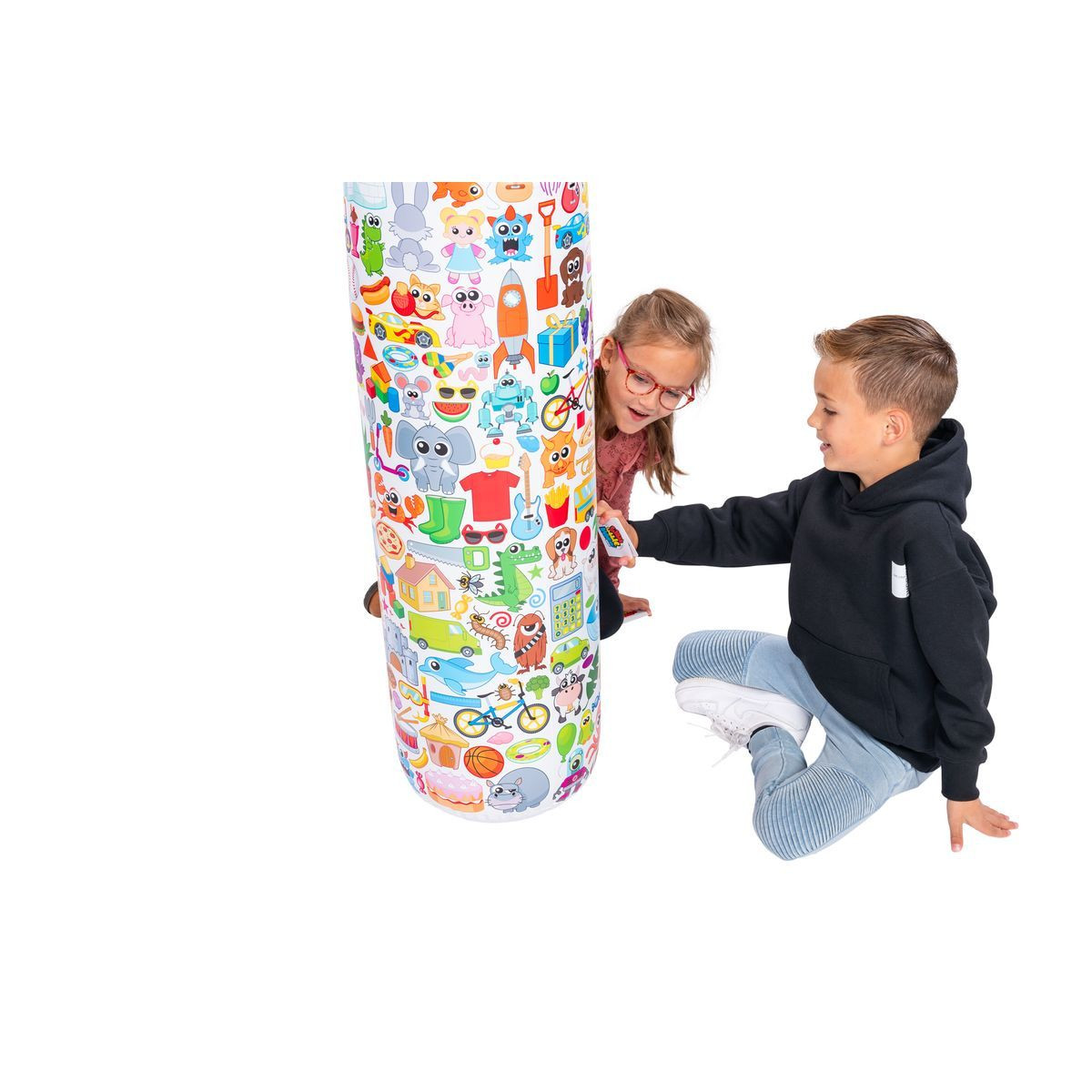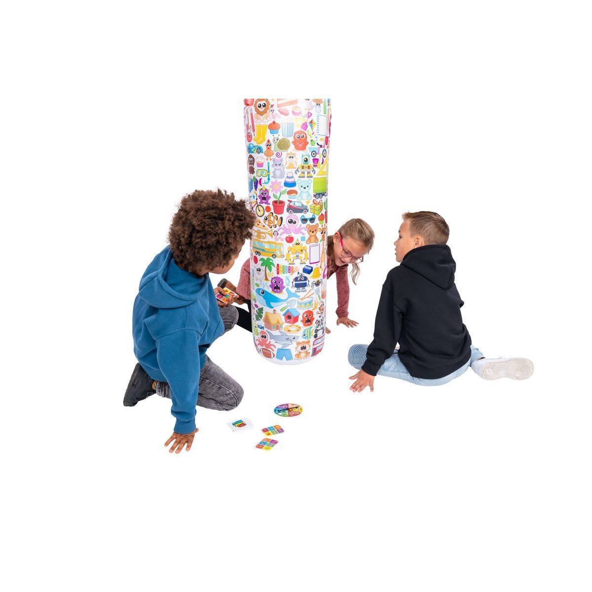 Contents: 1 giant inflatable Wobbler, 30 picture cards with 180 illustrations, 1 spinner, 1 sand timer, instructions. The Wobbler stands about 120 cm tall but won't fall over thanks to its weighed base. Requires 2 litres of water to fill the compartment nearest the ground.