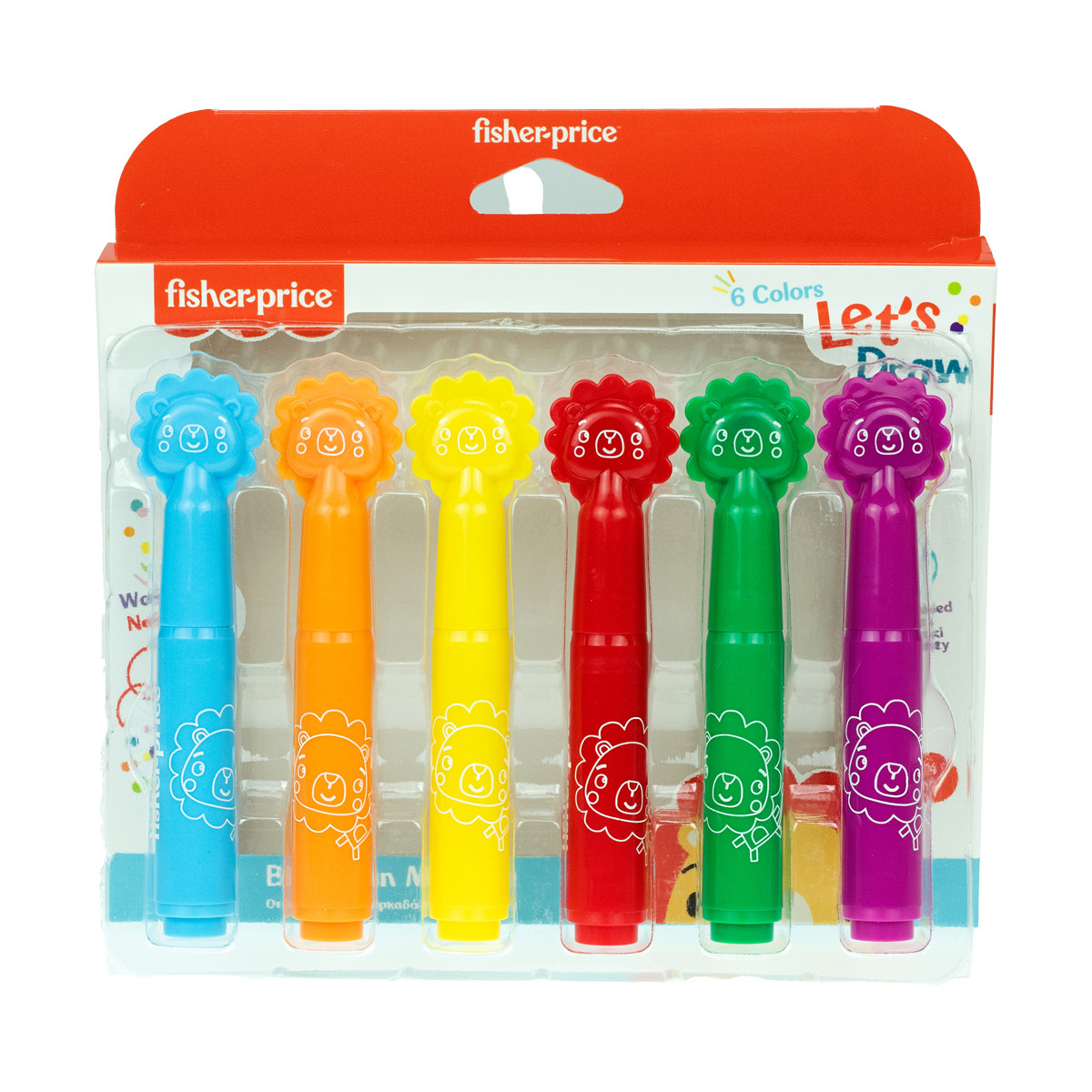 6 pieces of different colors, with 3D cap, washable markers 12cm long & 2.5cm diameter with a round writing tip 0.7cm thick.