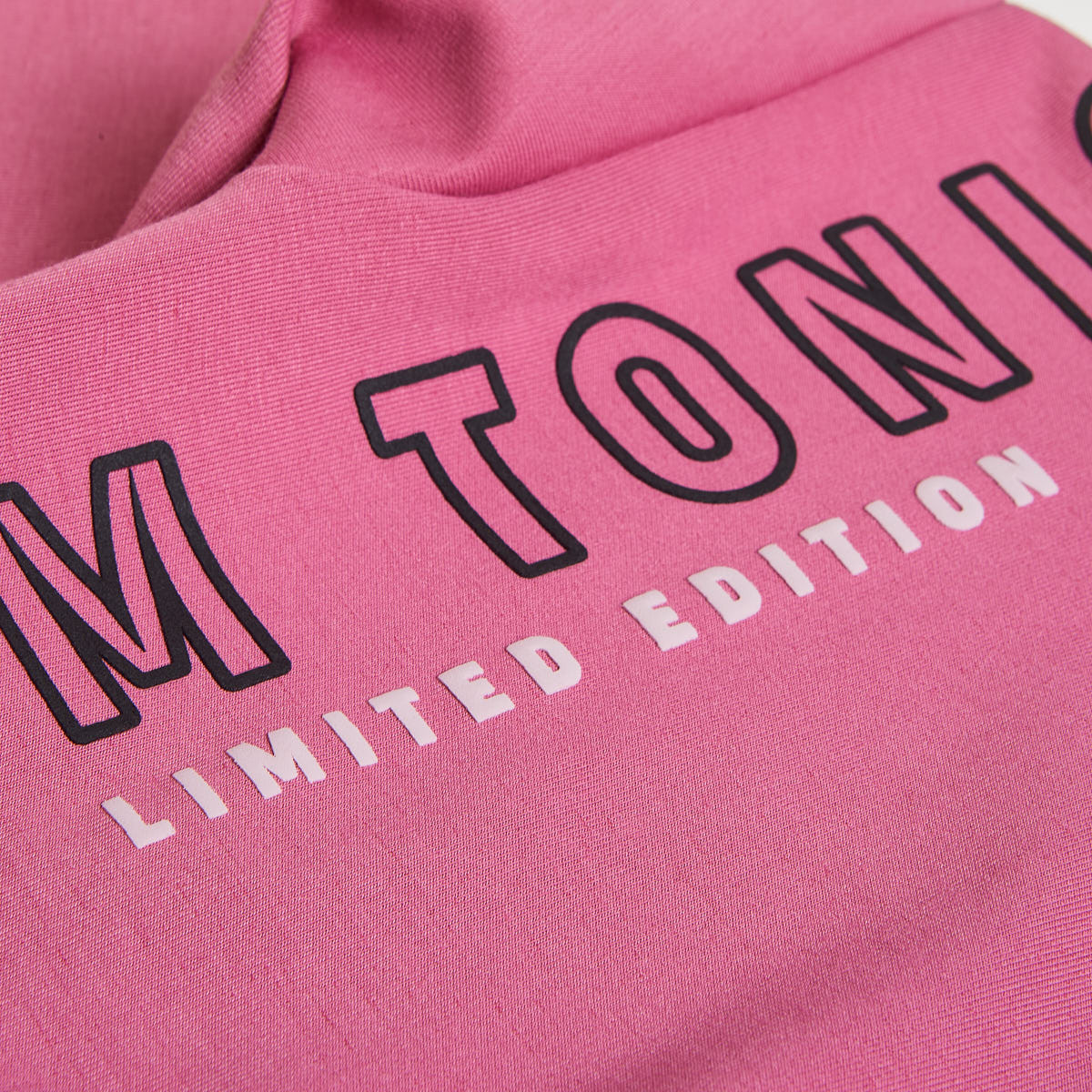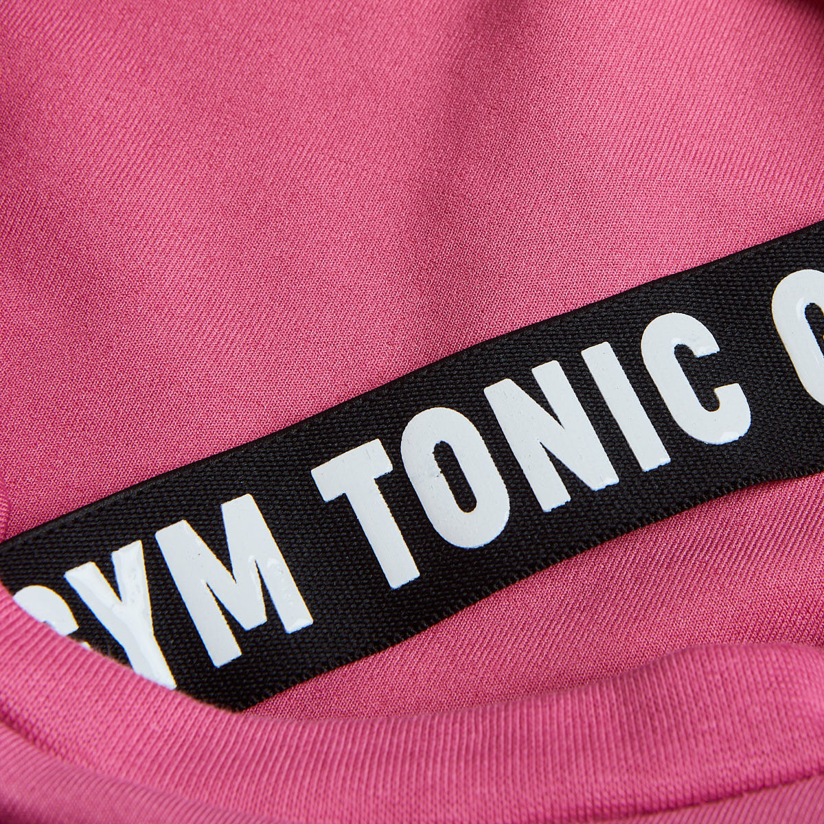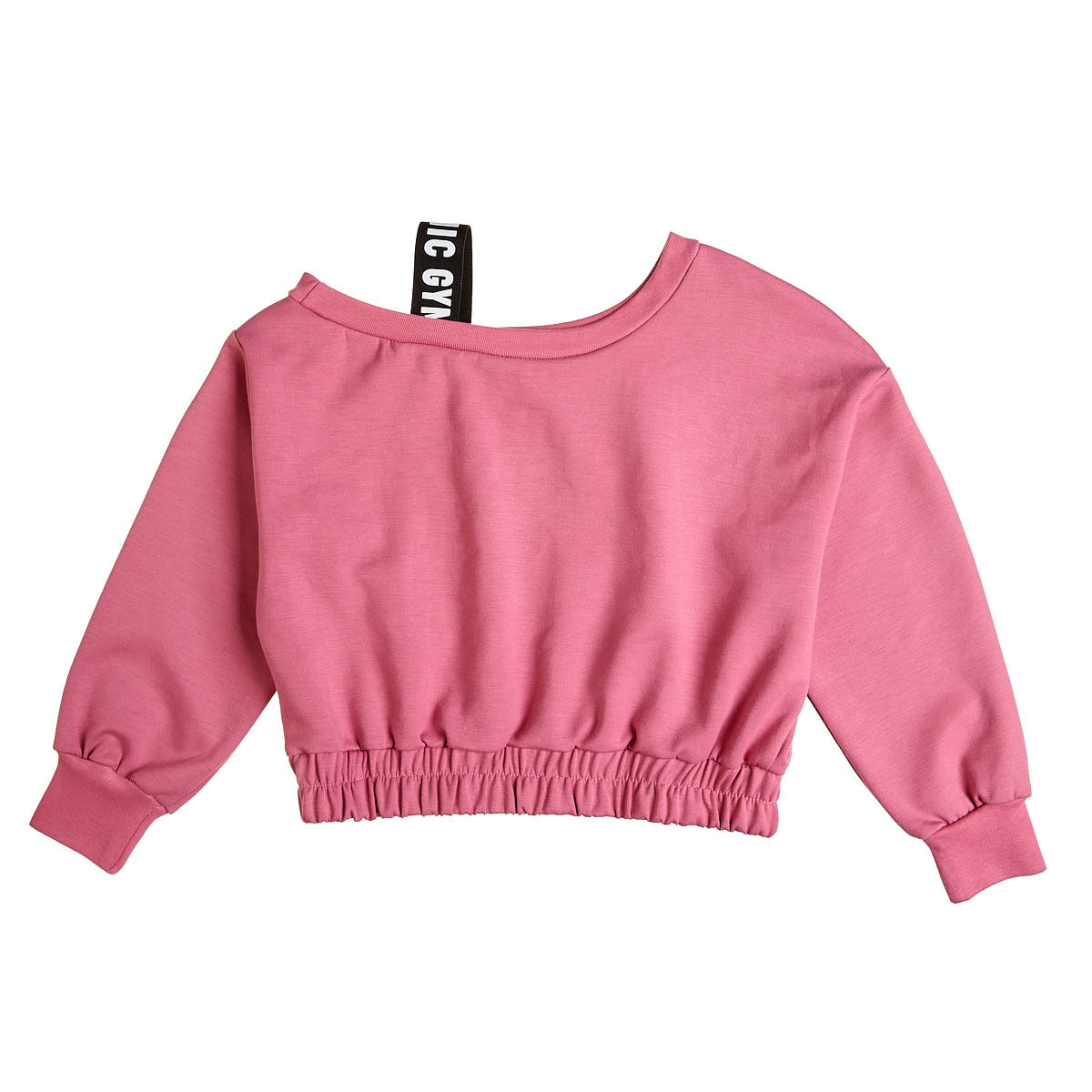 Crop top with graphic embossed print on the front, wide straps on one shoulder and elastic with ruching at the bottom.