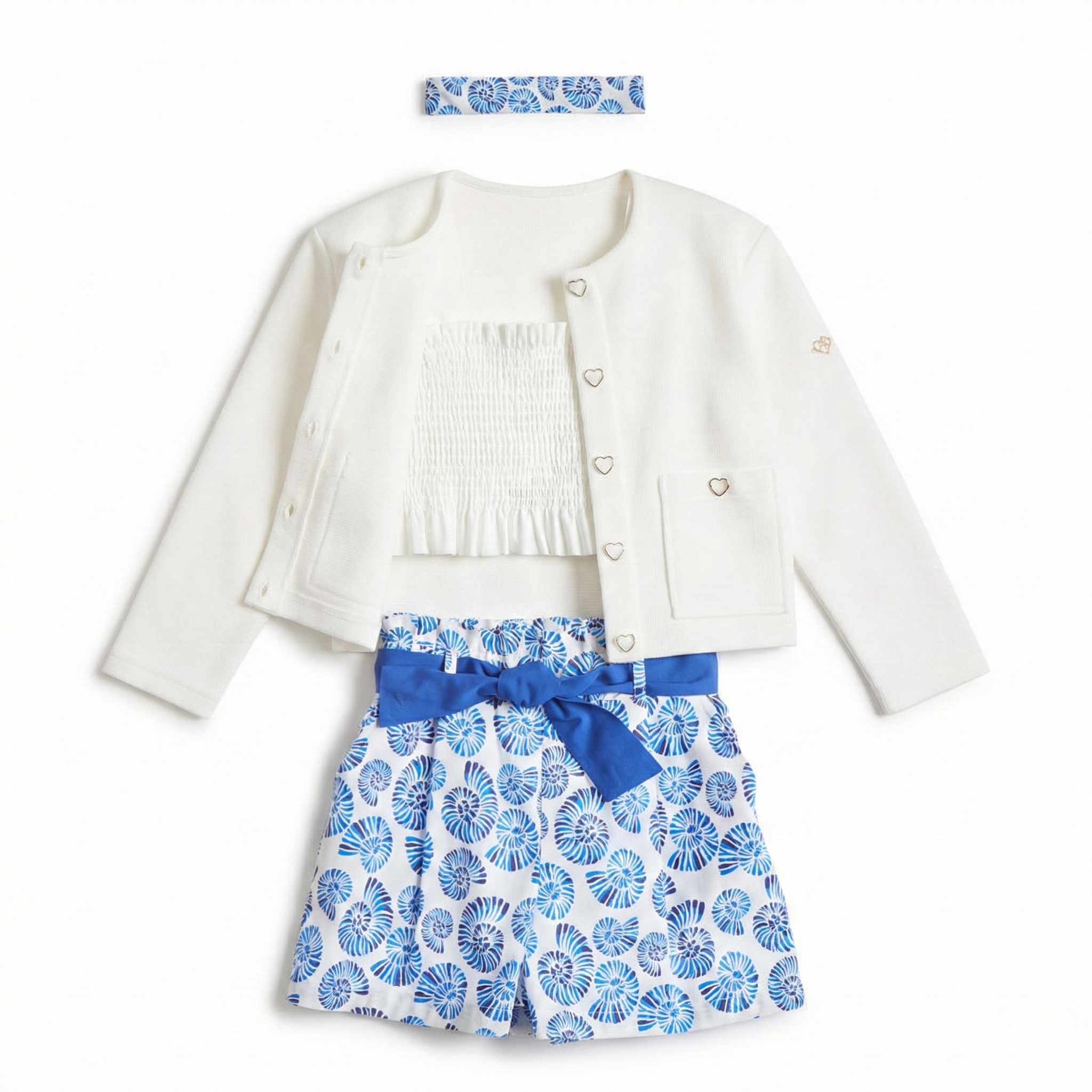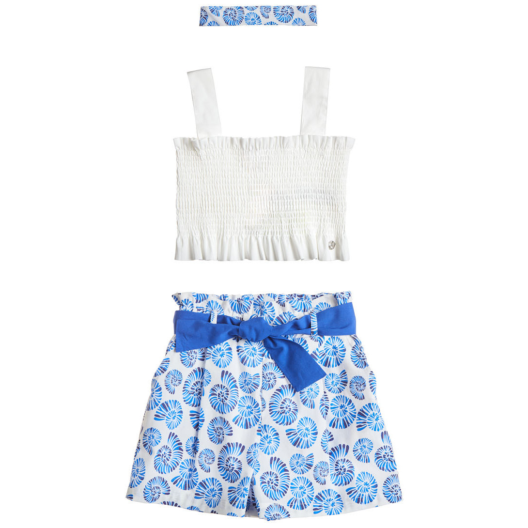 Set made of 100% cotton, consisting of a crop top, shorts and a matching hair band.