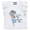 Blouse with short sleeves and a print on the front decorated with glitter and beads. }