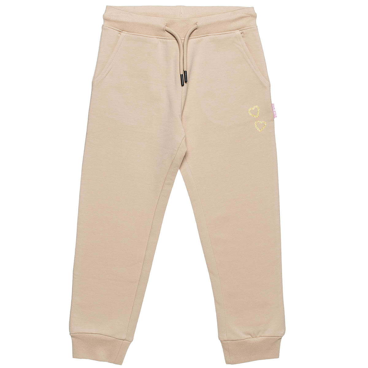 Tracksuit pants with elastic and drawstring at the waist for a better fit, side pockets and a discreet glitter print on the leg.