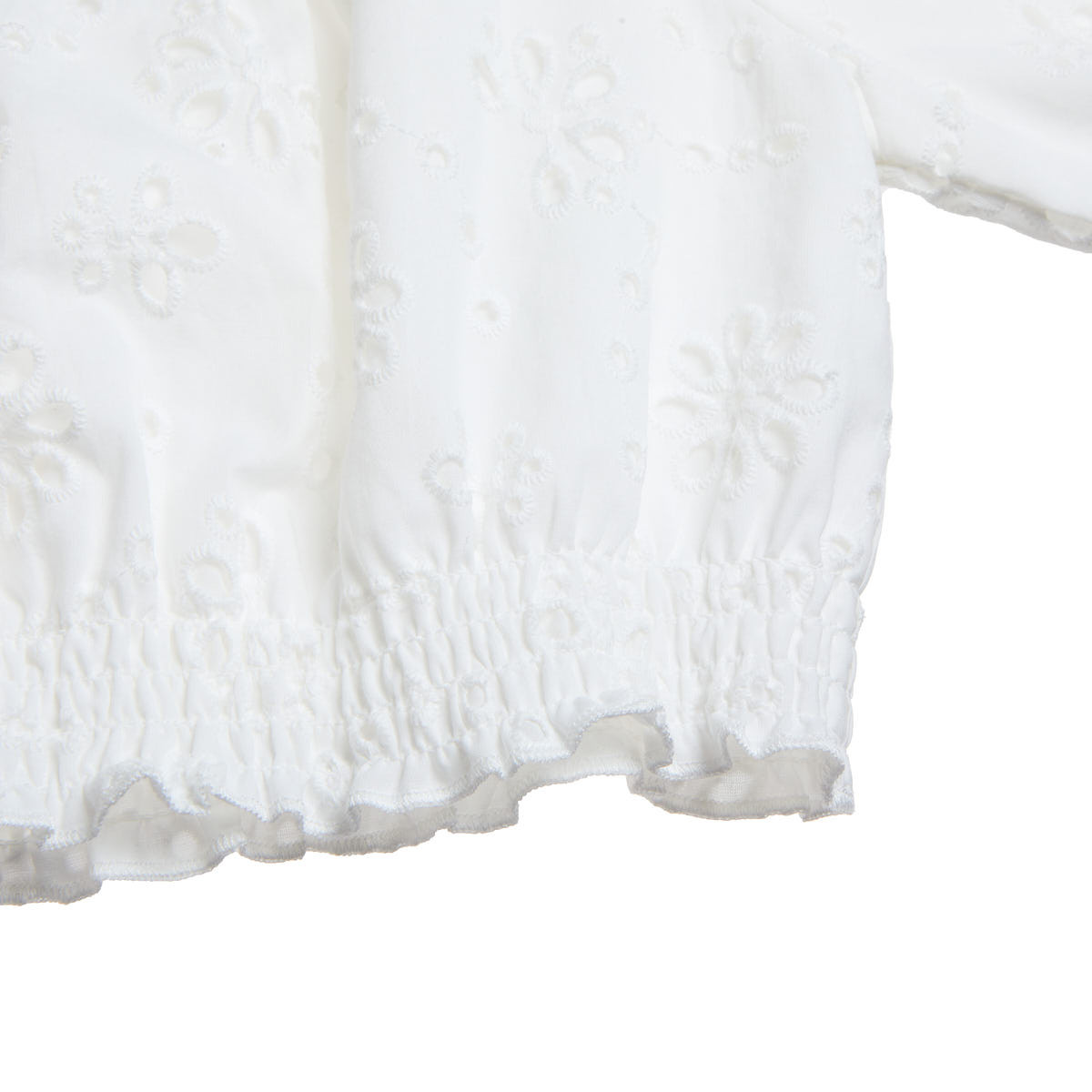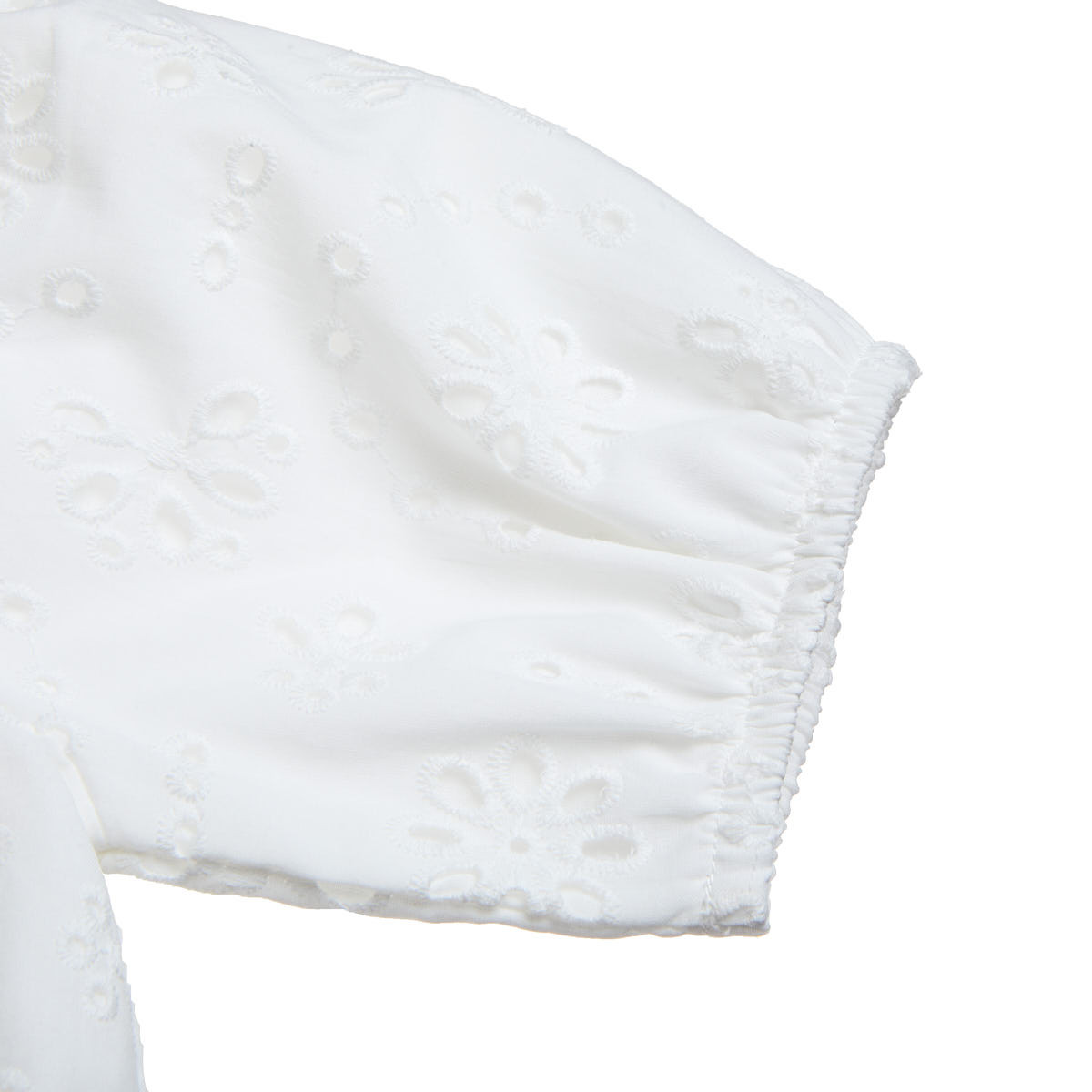 Pattern with perforated embroidery and elastic at the neckline, sleeve ends and bottom.