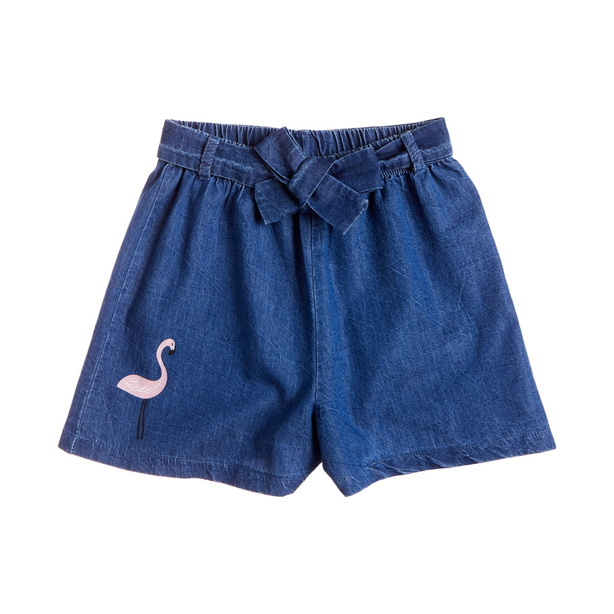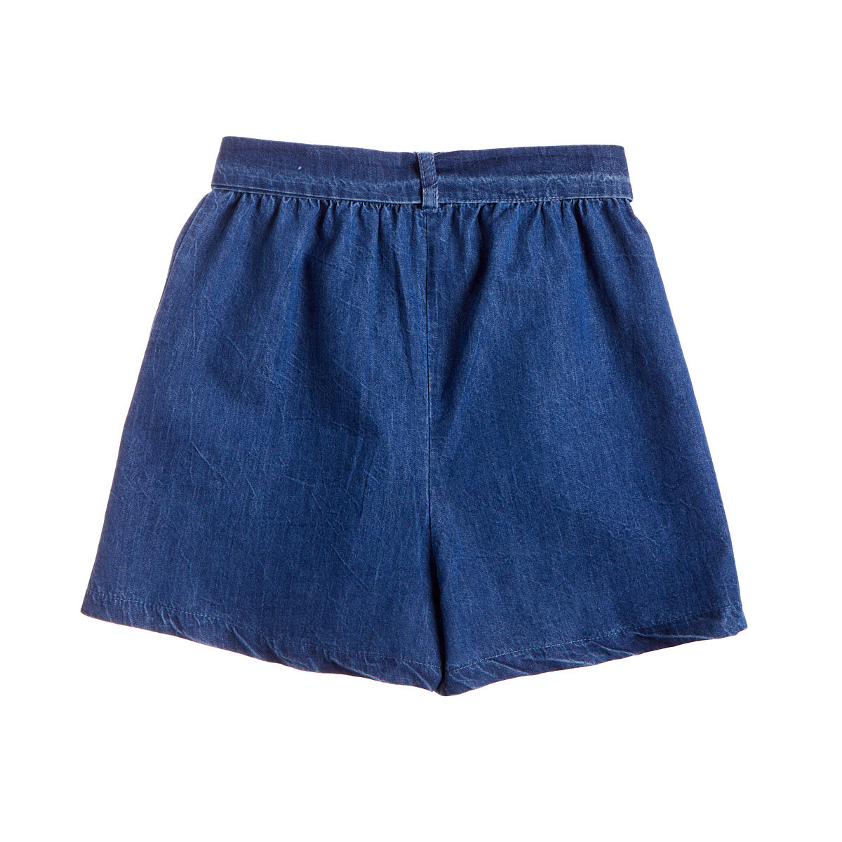 Shorts made of extremely soft, thin cotton denim fabric with elastic at the waist and removable tie belt.