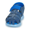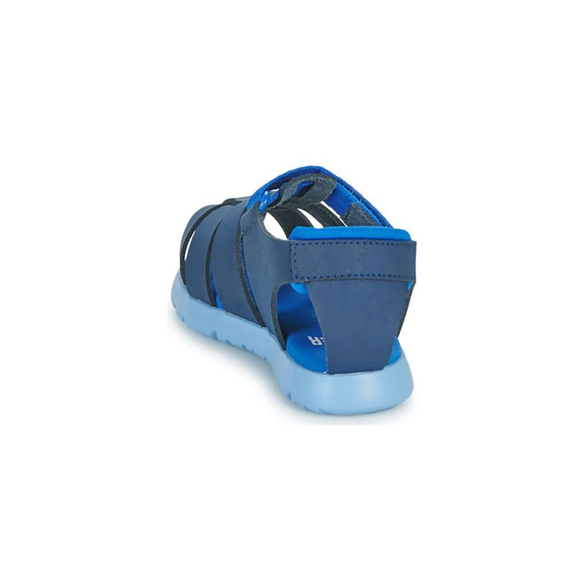 In blue, with a chel colored sole and a blue strap on the strap and on the back.