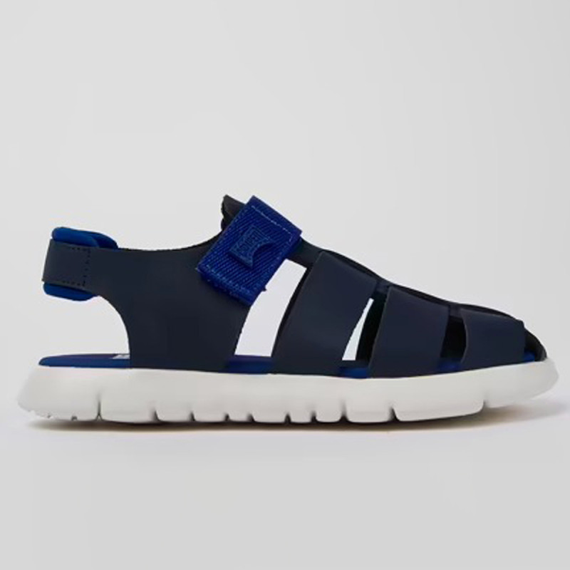 In blue, with a chel colored sole and a blue strap on the strap and on the back.