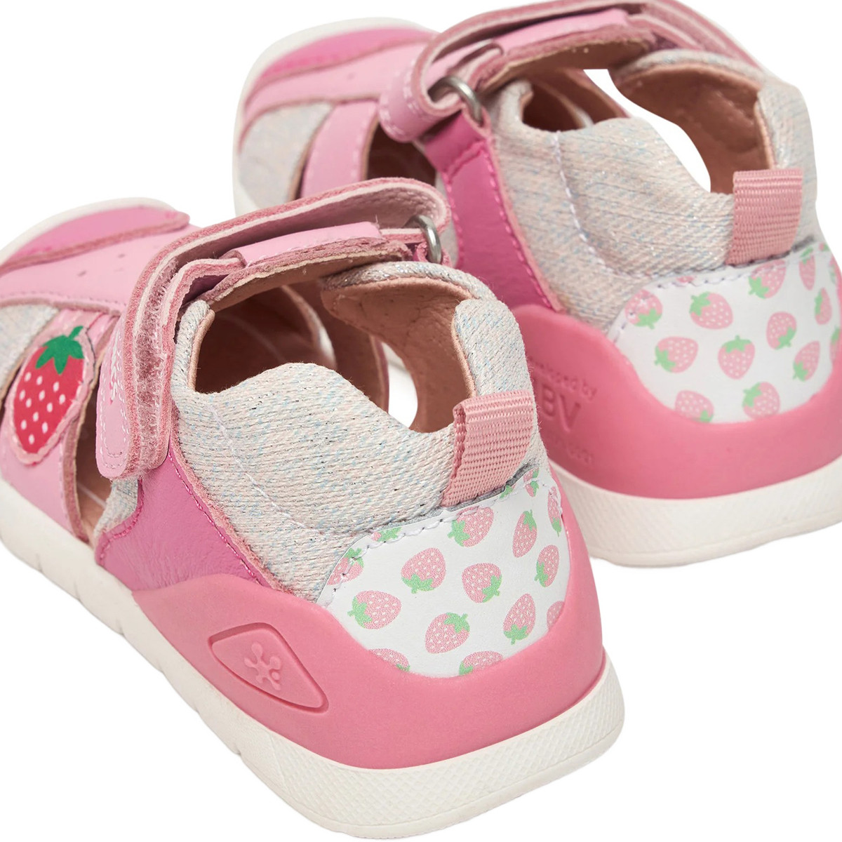 It has a closed toe, in white and soft pink, decorated with a strawberry embossed design.