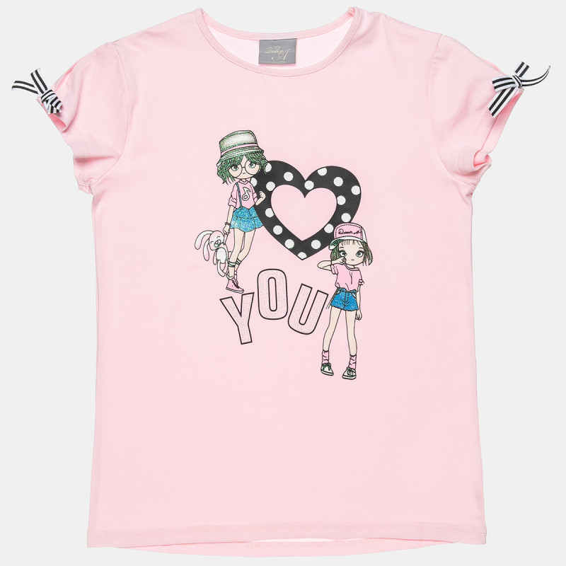 Cotton blouse for little ladies. It has a print on the front with glitter details and a slightly asymmetrical cut on the bottom with a longer back.