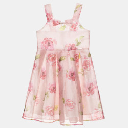 Dress with a floral pattern, a decorative bow on the front and a zipper on the back. }