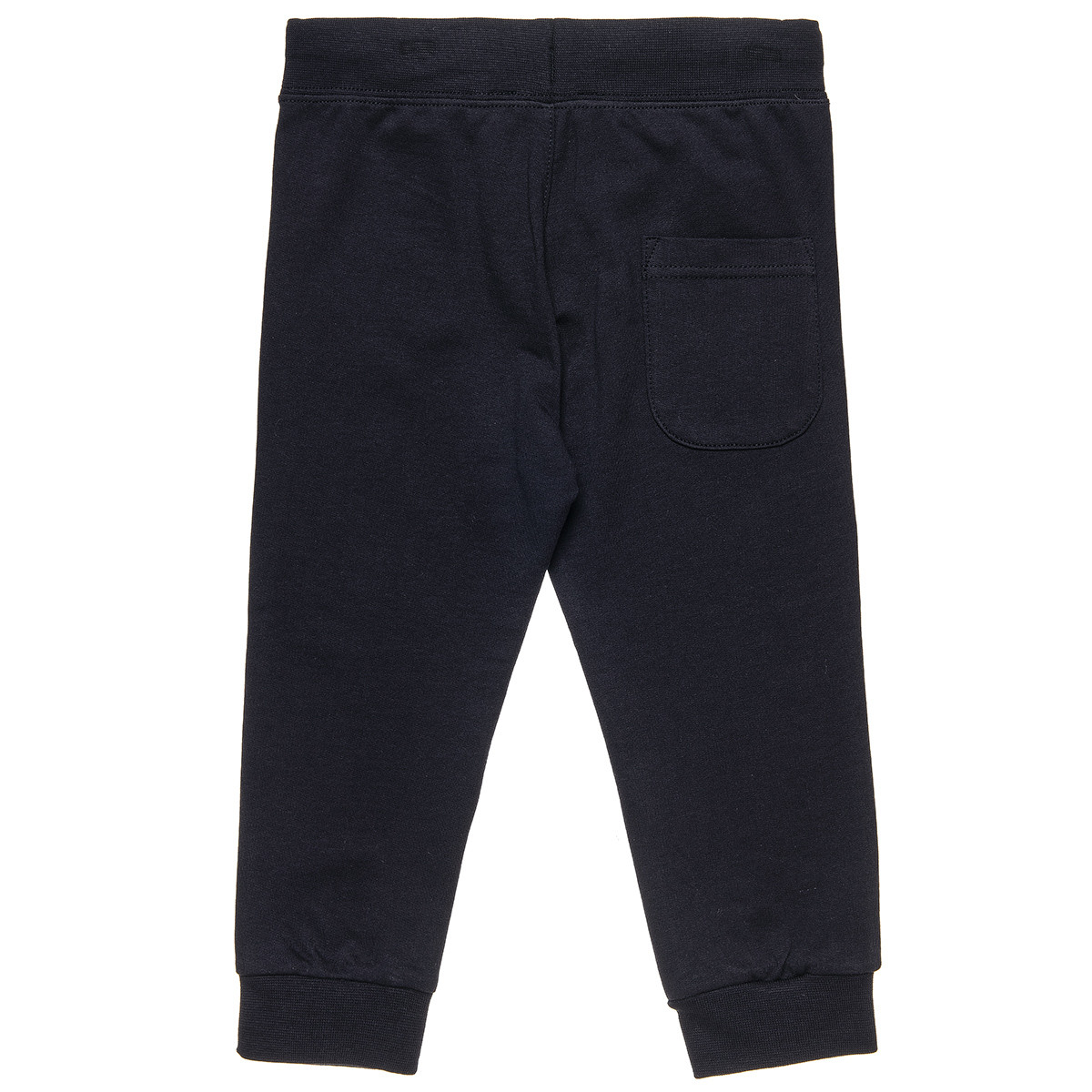 It has two pockets on the front and one on the back, embossed print on one leg and has a rubber band in the middle with laces for a better fit as at the bottom.