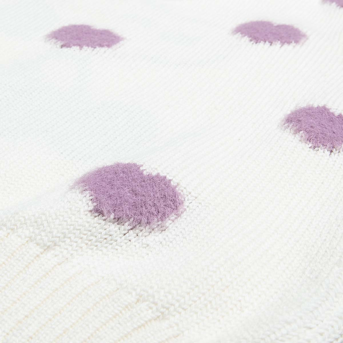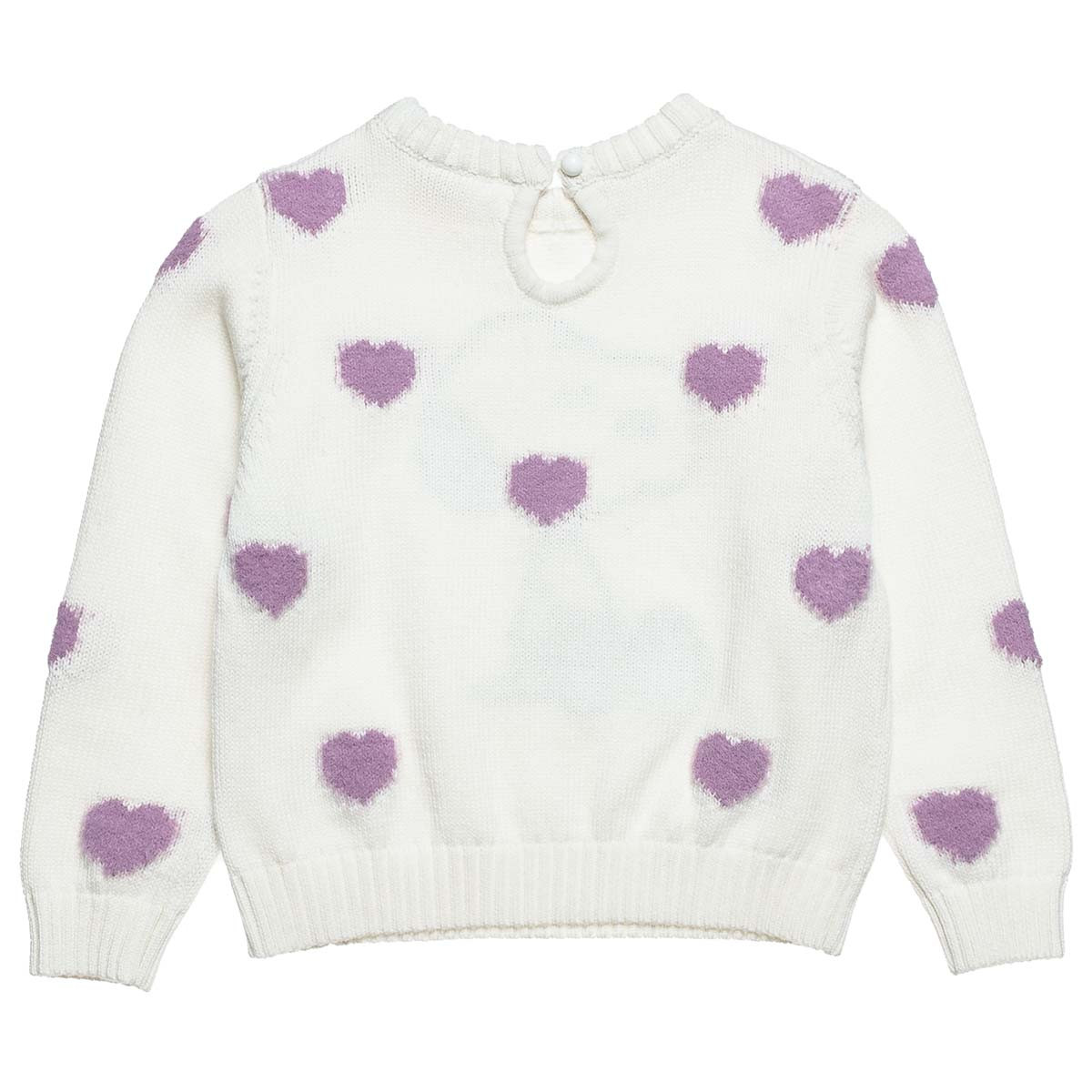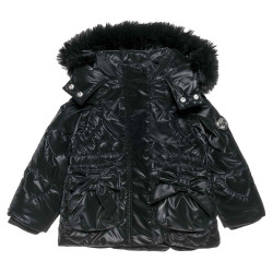 Quilted jacket with hearts. Removable eco-fur around the hood. For more warmth, eco-fur lining inside the hood. High neck with studs for greater protection from the cold. Patch on the sleeve, elastic at the end of the sleeve, front pockets with decorative bows and a label for the child's name inside. Warm and rainproof. }