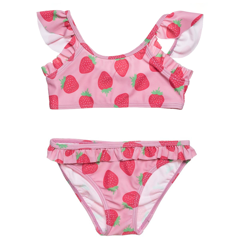 Bikini swimsuit consisting of a bra and matching briefs decorated with ruffles.