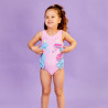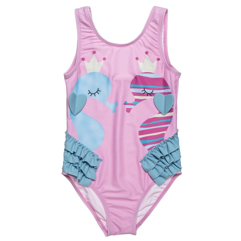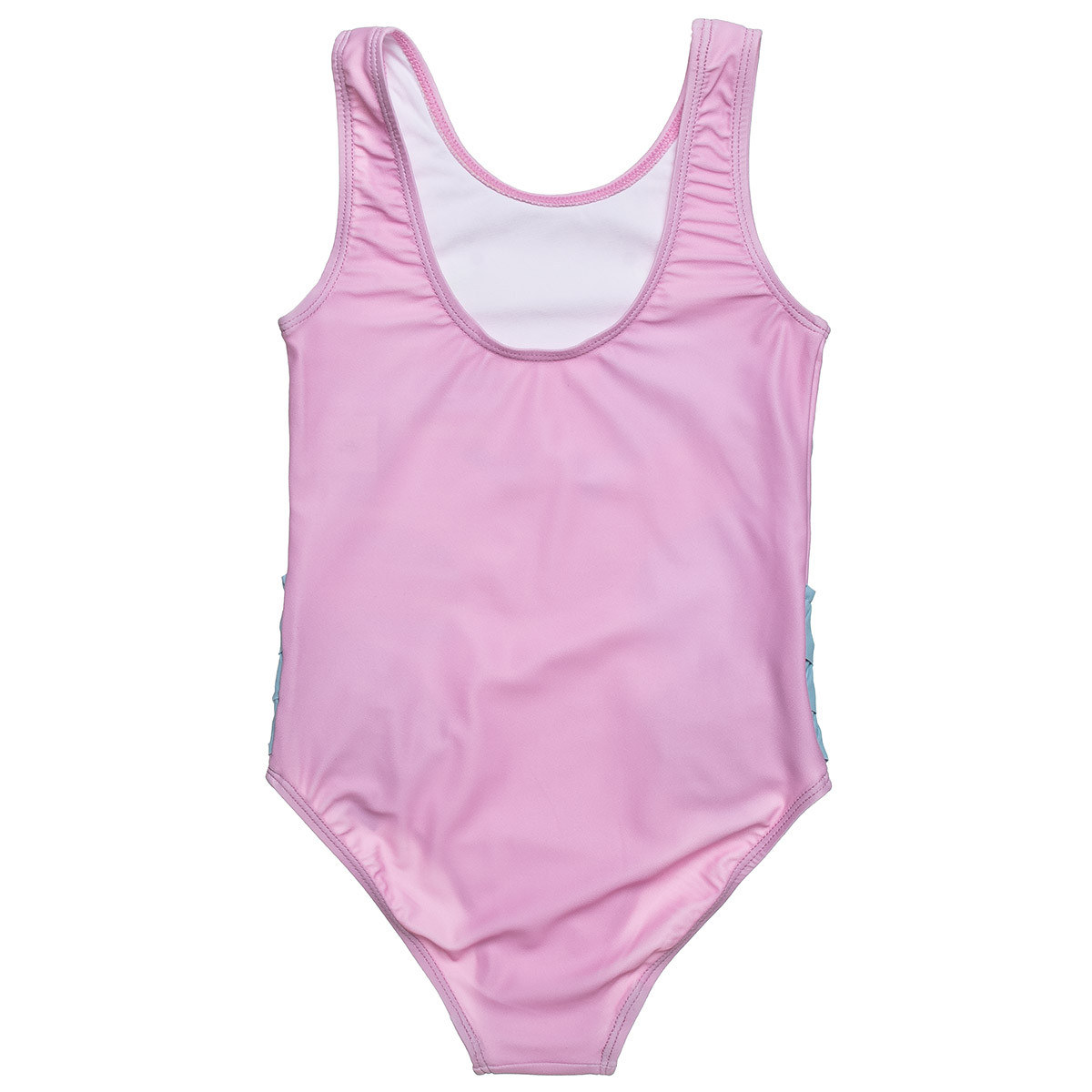 One-piece swimsuit with embossed elements and ruffles on the side.