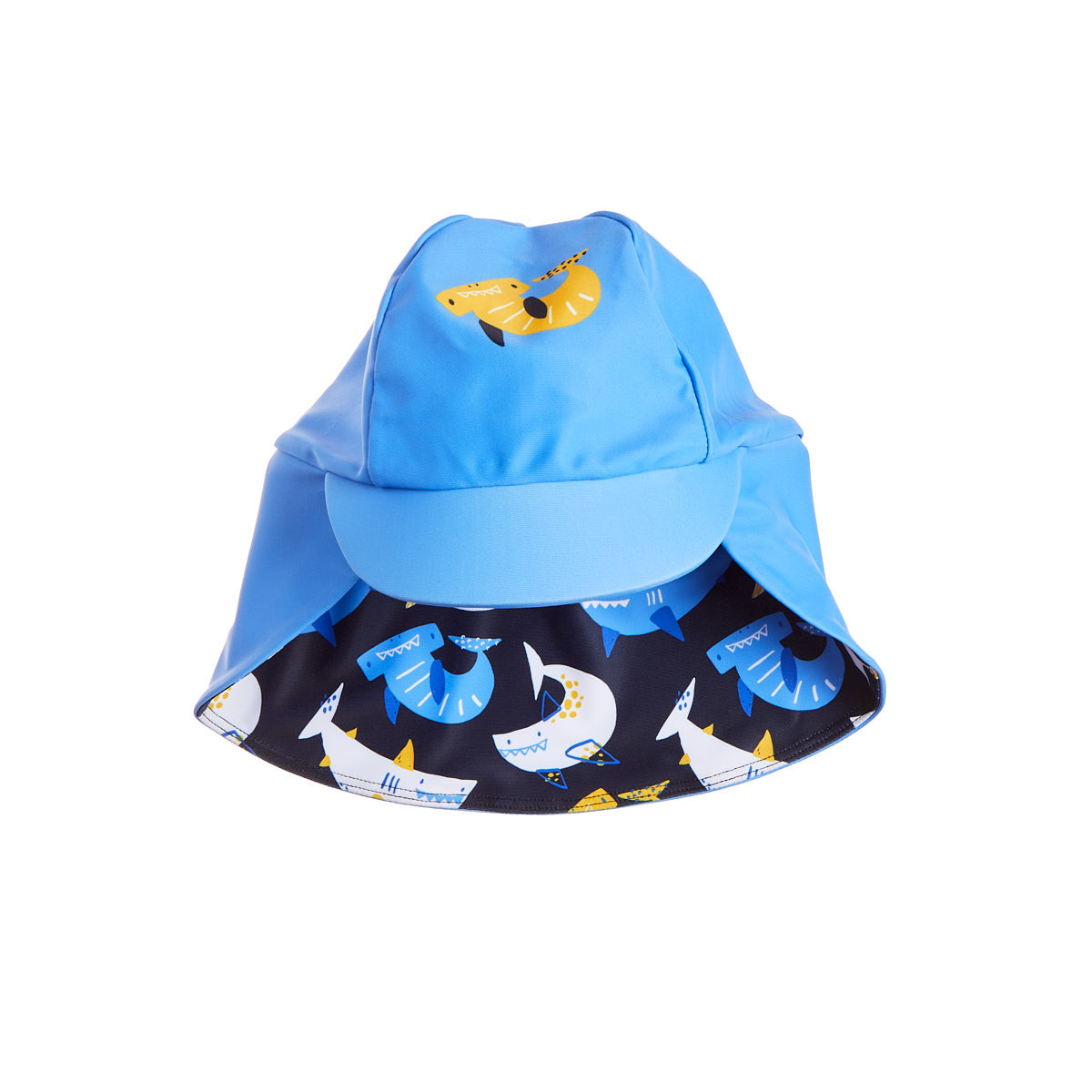 Legionnaire-style hat with visor protects the child's head, ears and neck in a beautiful blue color with a shark pattern.
