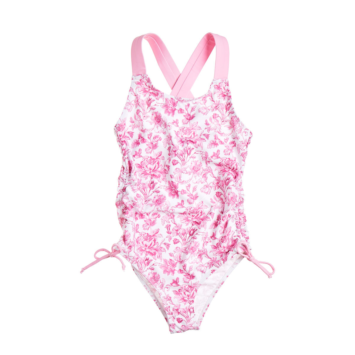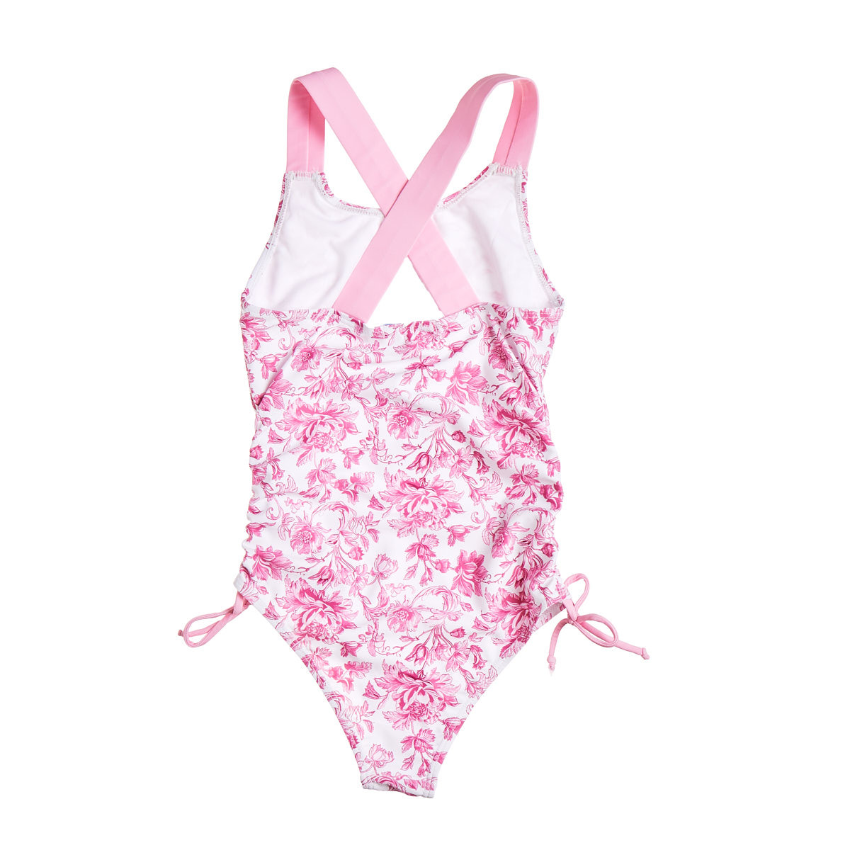 True Blue one-piece swimsuit decorated with a striking floral pattern in shades of pink.