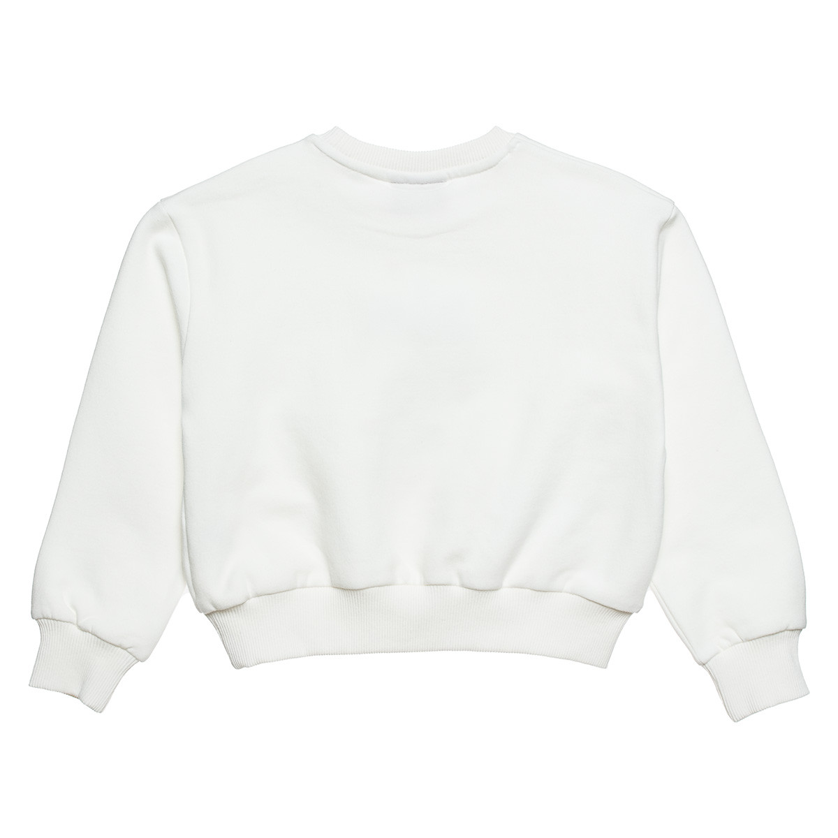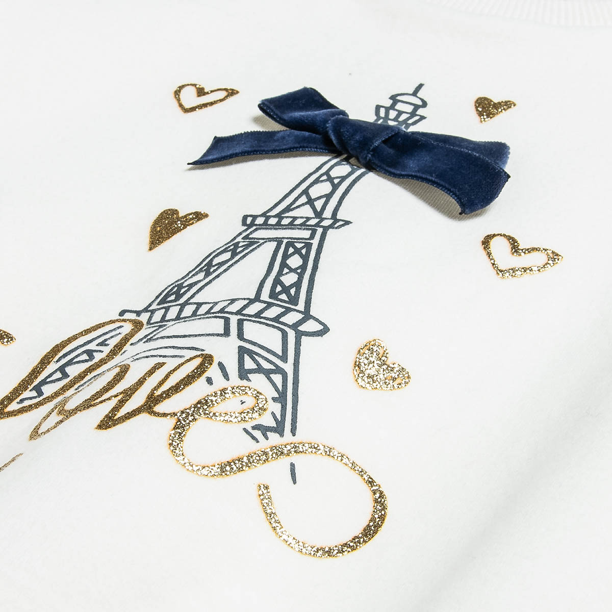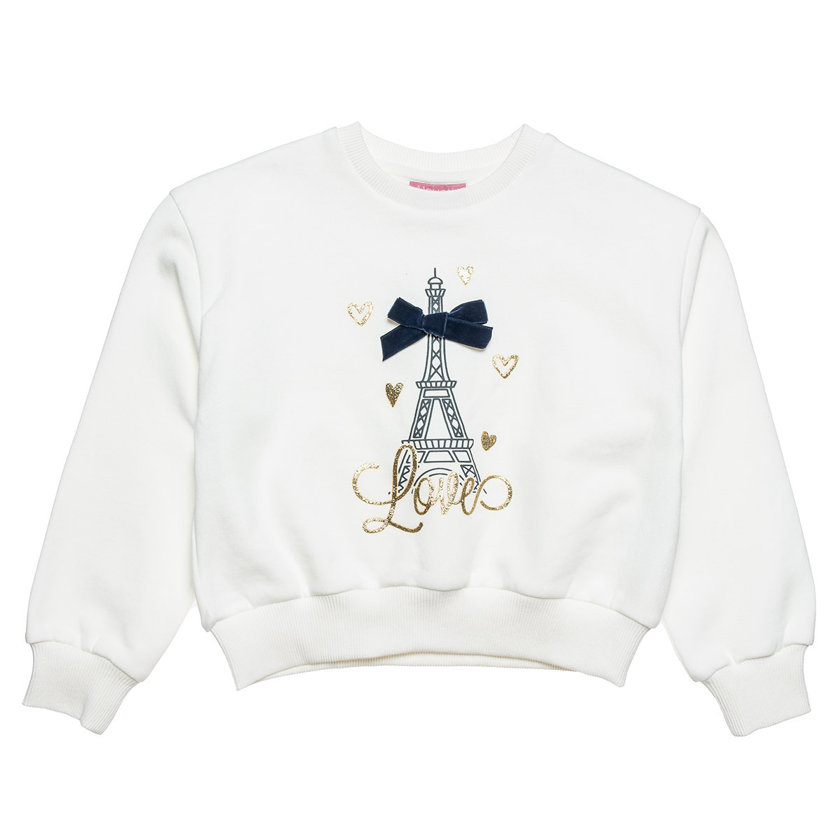Modern and girly, this sweatshirt stands out with its soft velvet bow and shiny glitter touches.