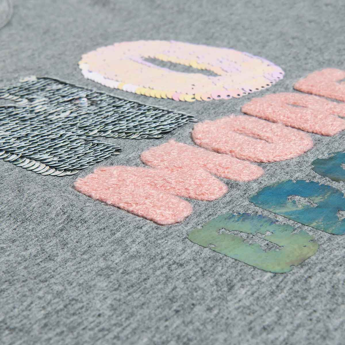 Shiny blouse with double sequins in silver and white and embossed letters with a sheepskin texture.