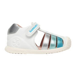 Biomecanics sandals for girls. A sweet children's sandal with a closed toe, specially designed for girls. The cheerful bottom design with fish, shells and marine elements adds a playful mood. Flexible and lightweight sole that allows natural movement and comfortable walking. Anatomically reinforced heel for stability and proper support. Closed toe... }