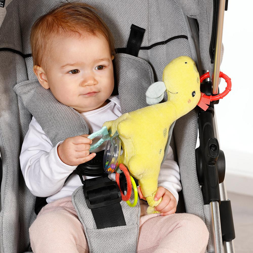Educational fun at home and on the go: The cute activity dinosaur from the Happy Dino collection can be flexibly attached to the stroller, car seat or bed with the practical C-ring.