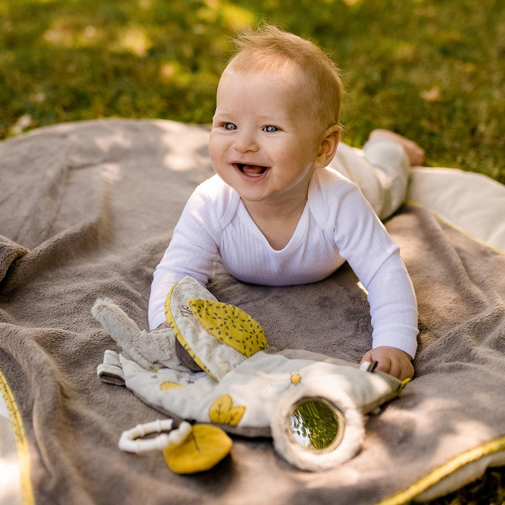 The squeak, the rattle, the crumpled paper, the mirror train the baby's sense of touch and first self-awareness.