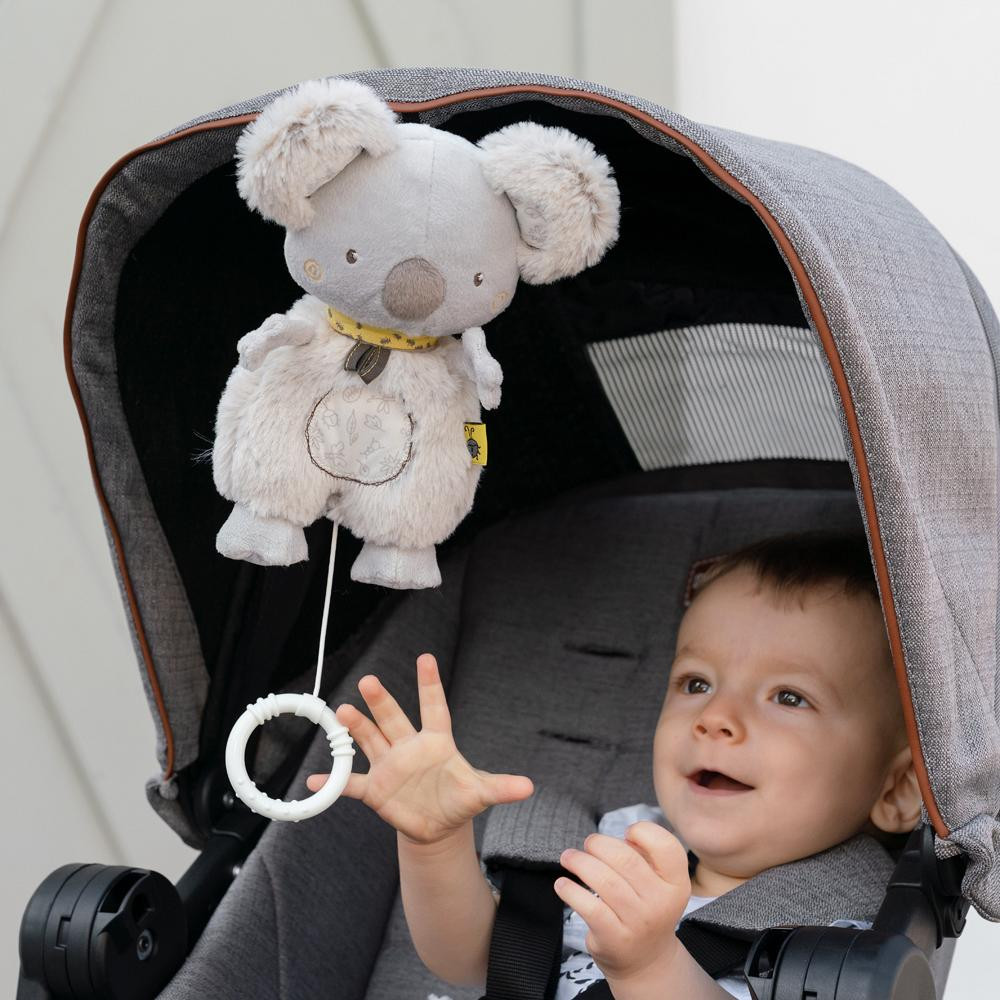 Thanks to its convenient size and fastening ribbons, the plush koala can always be by baby's side.