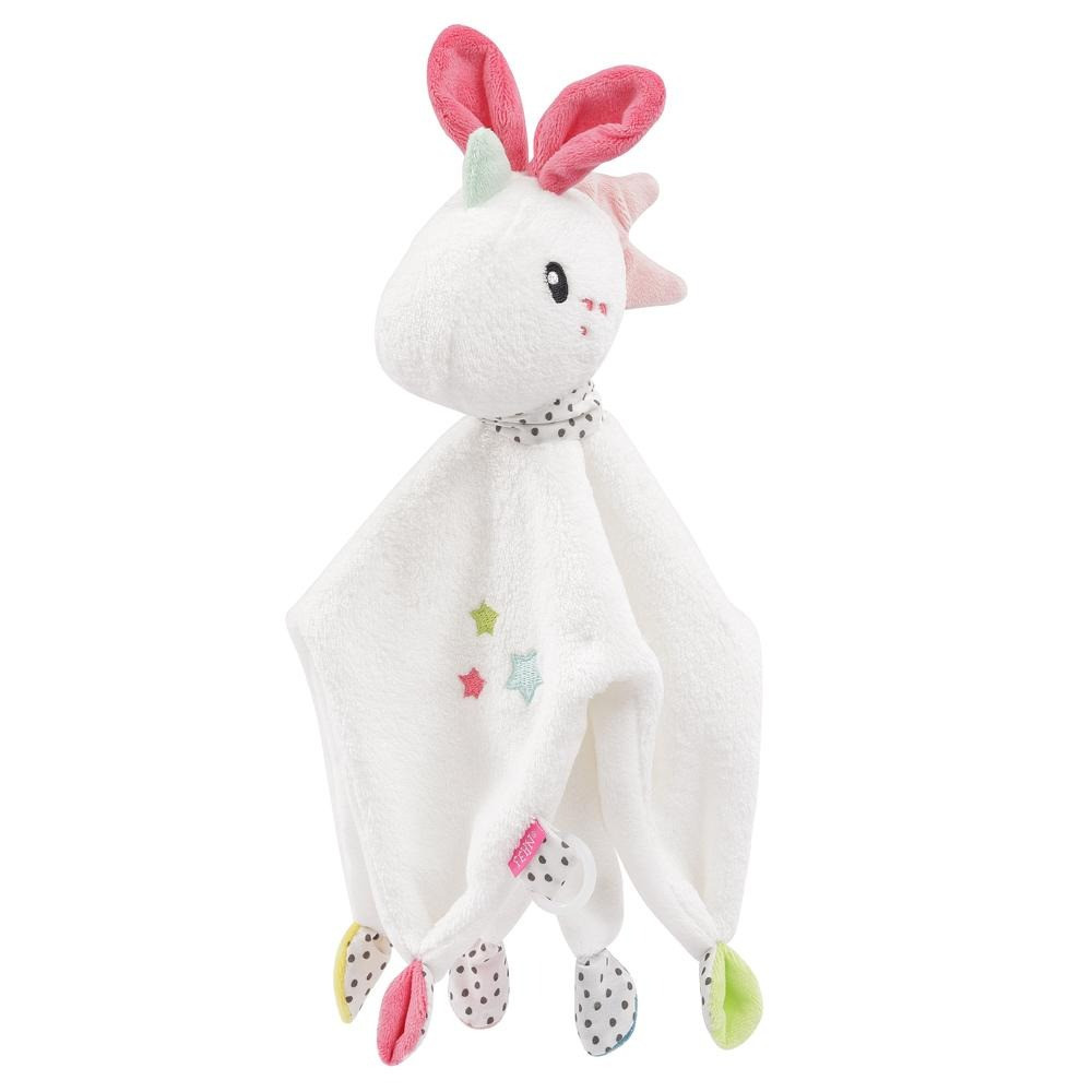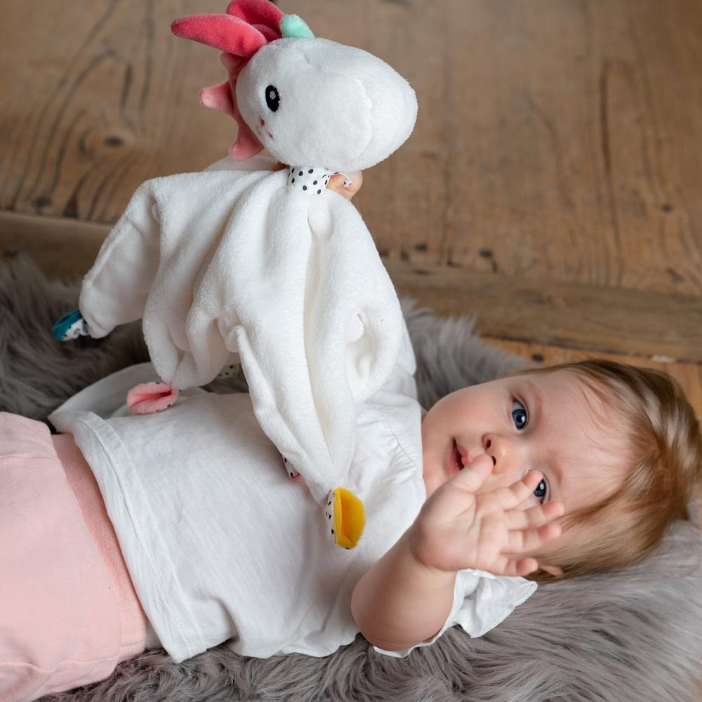 The soft material, unicorn head and tied ends invite grabbing, touching and cuddling, so that Aiko is a great companion at home and on the go.