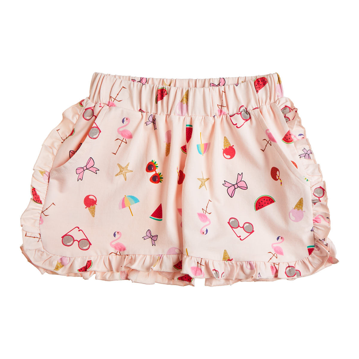 Shorts with side pockets, matching print and ruffle around the perimeter.