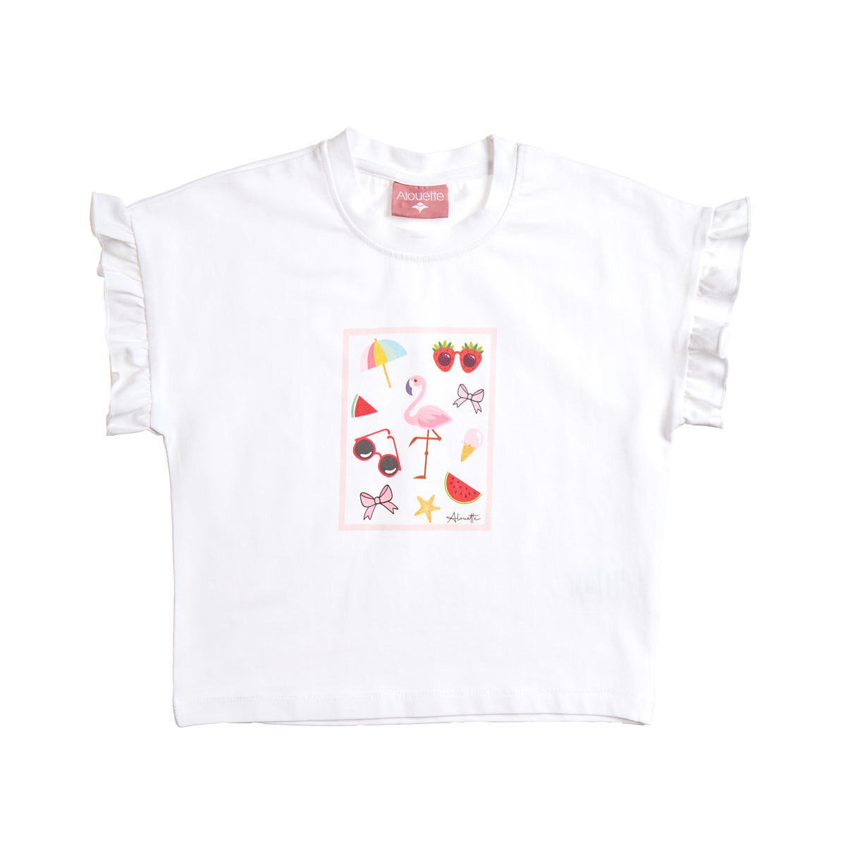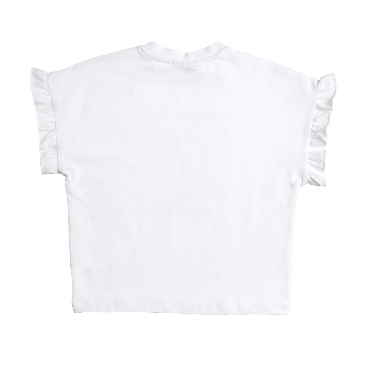 Blouse with print on the front and ruffle at the end of the sleeves.