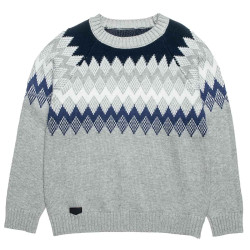 100% cotton sweater with geometric patterns. Ribbed neckline, sleeve cuffs and hem. }