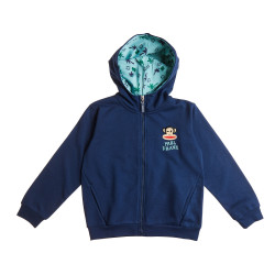 Paul Frank jacket for boys, made of lightweight, lint-free sweatshirt fabric. Hood with print on the inside, embroidery on the front, side pockets and embossed lettering on the back. }