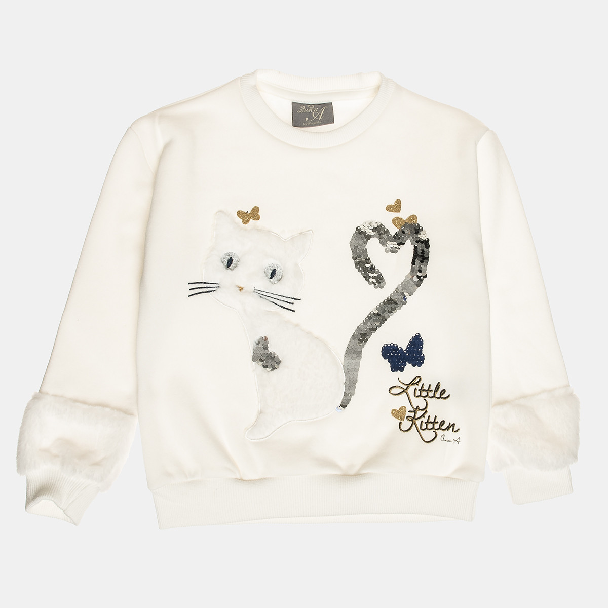 Eco fur sleeve and front embroidery details, double sequin design and glitter lettering print.