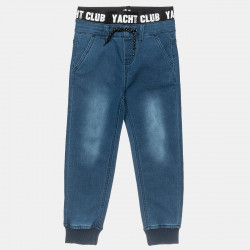 Pants made of soft denim fabric with elastic and drawstring at the waist. It has 2 side pockets and 2 back. The bottom has elastic for a tighter fit. }