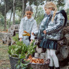 It features a collar that closes with a button at the back and shirt sleeves with a bow and pearl button at the sleeve end.