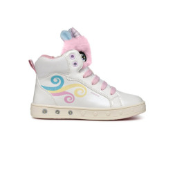 Breathable comfortable mid-cut sneaker for girls with an on-trend feel and plenty of sporty appeal. This white version of Skylin features a cheerful upper embellished with multicolored print designs and a cute 3D detail on the tongue. Crafted from a pearlescent patent-effect and a faux-fur-effect material, it will keep children constantly amused thanks... }