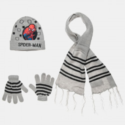 Spiderman set consisting of cap, scarf and gloves. Cap with soft knit, Spiderman patch, turned hem with embroidery. Striped gloves and scarf with striped pattern and fringes on the bottom. It is available in one size and covers ages from 1 to 5 years. }